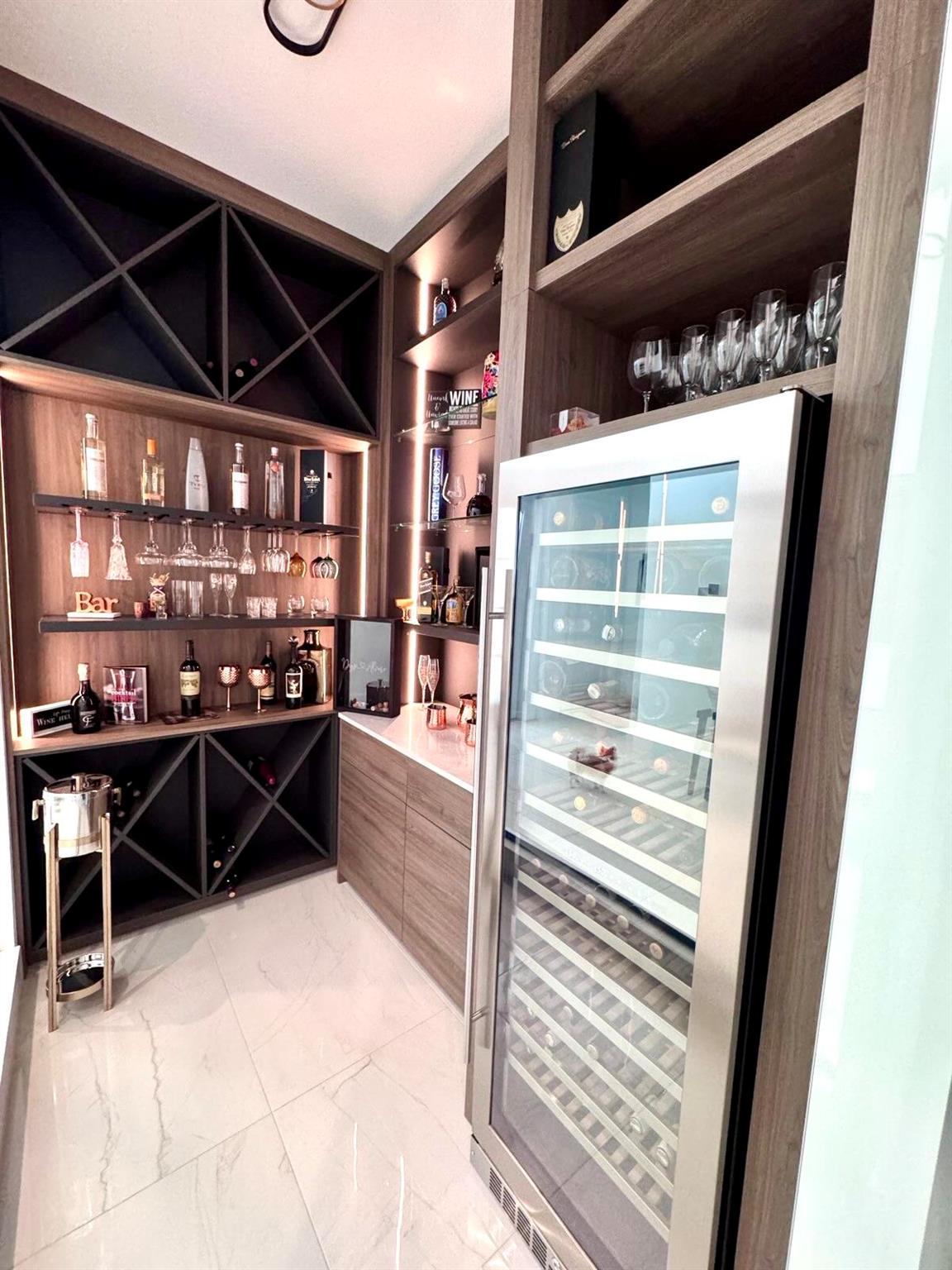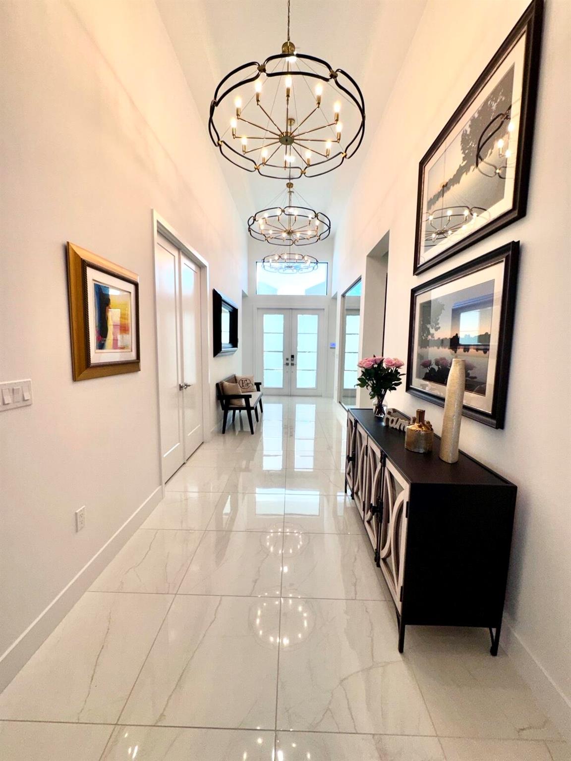 This elegant single-story residence in Apex at Avenir offers 4 bedrooms and 4.5 bathrooms, designed for comfortable & sophisticated living.The foyer features impressive 14- to 15-foot ceilings, creating a welcoming sense of openness. A custom walk-in wine room, elegantly displayed upon entry, adds a distinctive touch. Expansive windows allow abundant natural light to fill the home, enhancing the bright atmosphere. The great room, kitchen, and primary bedroom boast 12- to 13-foot ceilings. The kitchen includes stacked cabinetry, upgraded Sub-Zero and Wolf appliances, quartz countertops, and an apron-edge island. Upgraded 24x24 porcelain tile flows through main areas, with electric roll-down blinds and custom curtains. Custom closets, a 3-car garage and extended screened lanai with paver