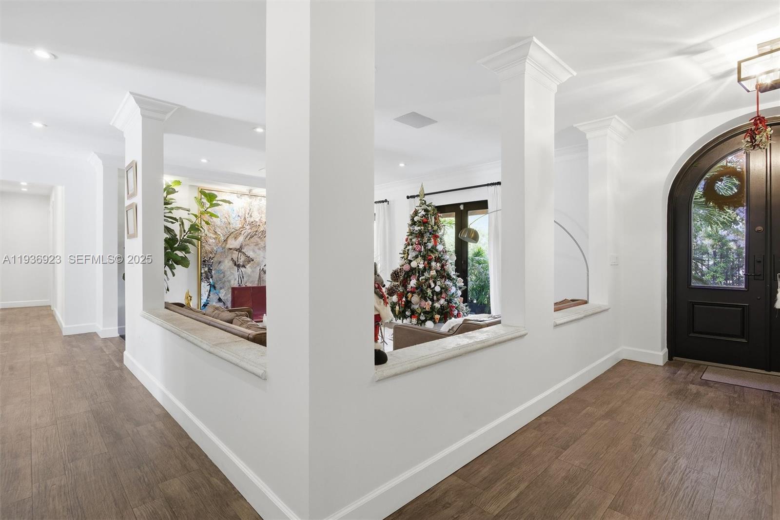 Situated at the end of a quiet cul-de-sac, this beautifully designed residence offers privacy, space, and refined living. A charming entry courtyard surrounded by lush landscaping welcomes you inside to bright, open living areas featuring impact-resistant windows and elegant wood-look tile flooring throughout. The kitchen showcases a butcher-block island, abundant custom cabinetry, and serene pool views—perfect for both everyday living and entertaining. The primary suite and three additional bedrooms are located on one wing of the home, while a private two-bedroom, one-bath suite on the opposite side offers flexible living options for guests, extended family, or a home office. Enjoy year-round outdoor living with a heated saltwater pool, plus added efficiency and peace of mind with solar panels. Located in the exclusive gated community of Gables by the Sea, with access to a neighborhood park and top-rated schools including Gulliver Prep and Pinecrest Elementary. A rare opportunity combining lifestyle, privacy, and elegance.