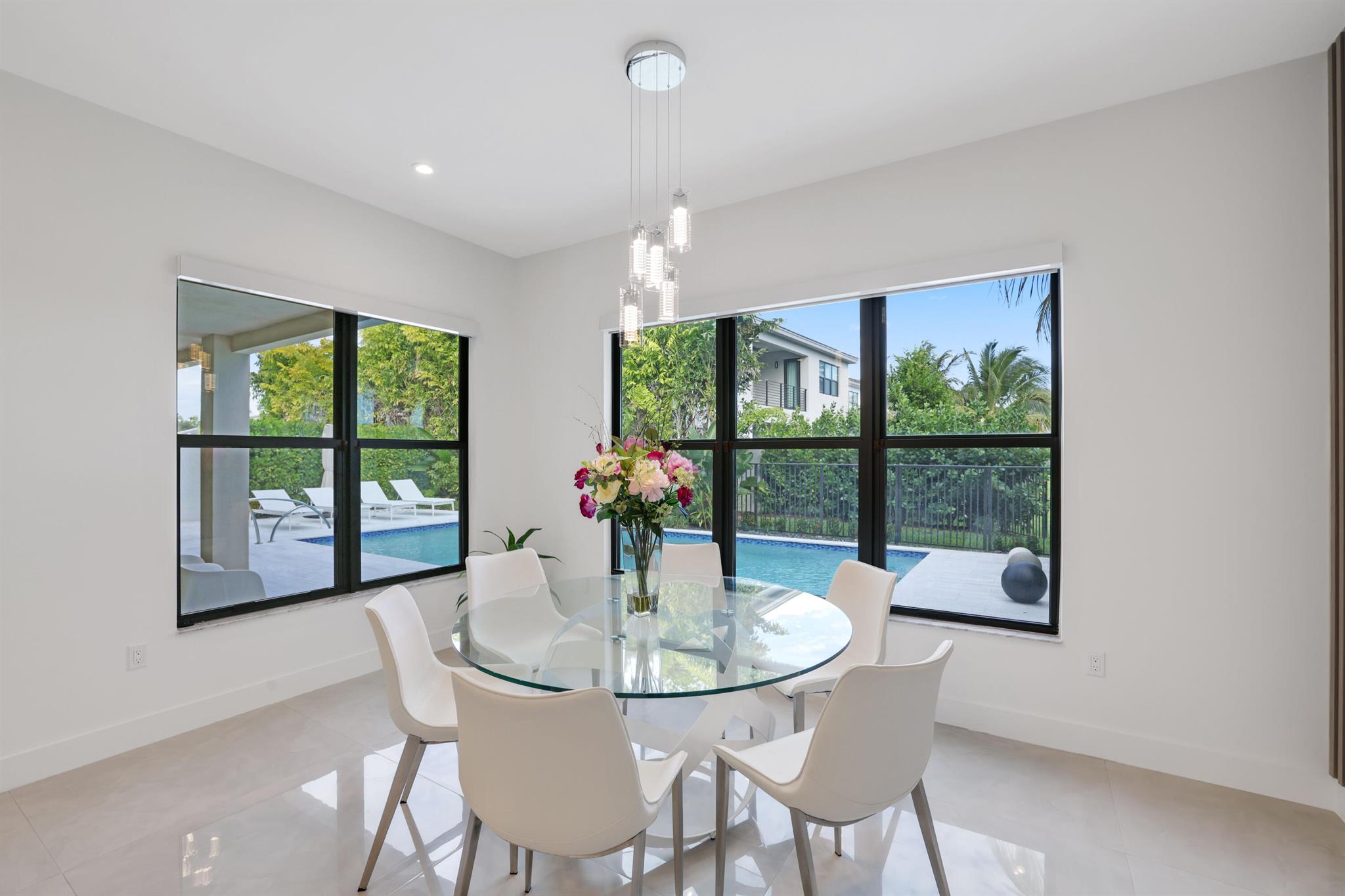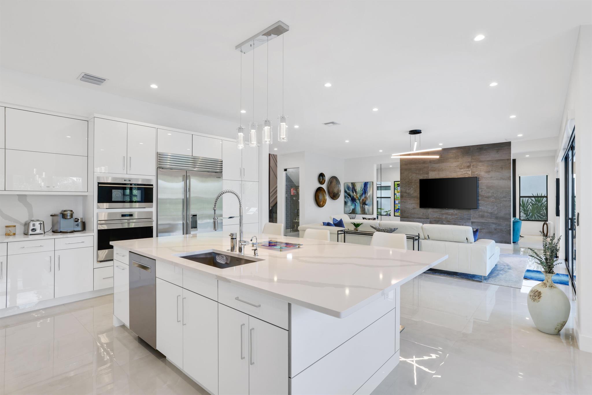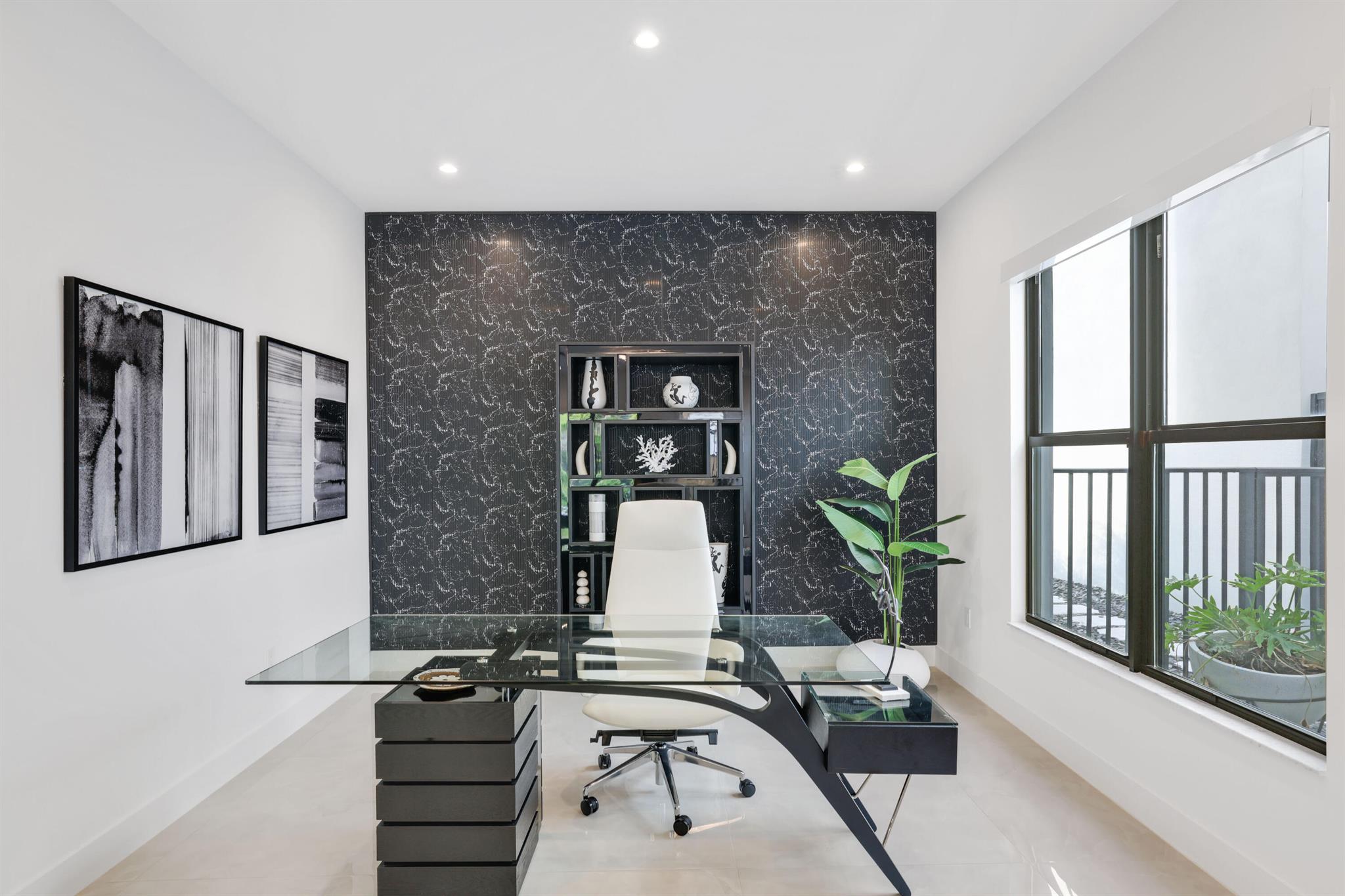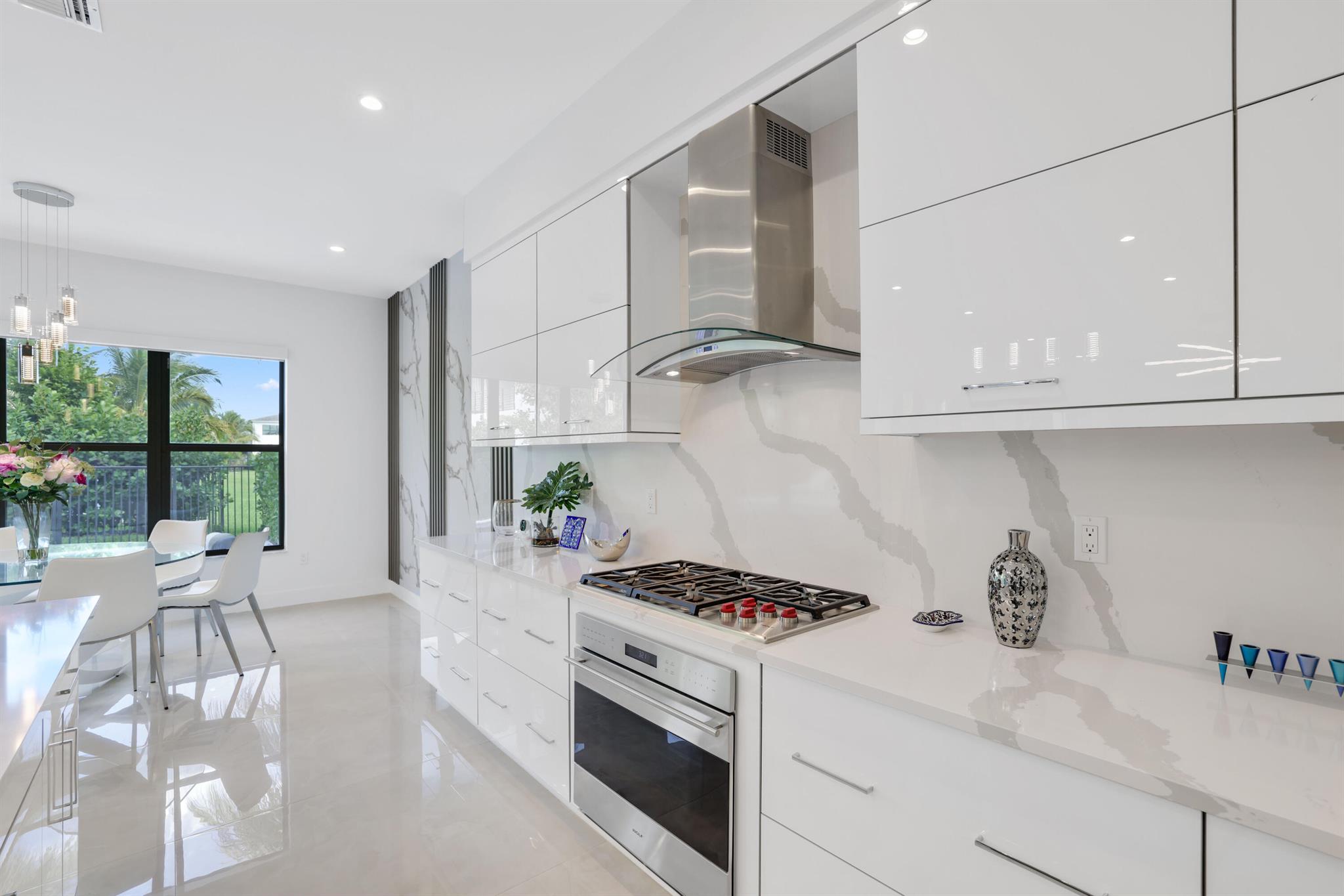 Turnkey luxury in Boca Raton's most prestigious community, the Maldives model in Lotus by GL Homes. This meticulously upgraded residence offers a total of 7,246 square feet with 5,378 square feet under air, featuring an array of premium finishes and smart design throughout. The gourmet kitchen showcases Wolf appliances, upgraded cabinetry, and a generous center island, while the first floor boasts Italian porcelain tile (4x4) and rich wood flooring upstairs. The spa-inspired master bath features a soaking tub and frameless glass shower, and contemporary details include a glass wall in the Club room, a glass door wine closet, and glass banisters. Electric shades throughout, upgraded light fixtures, and designer wallpaper and wall treatments complement the home's refined aesthetic.