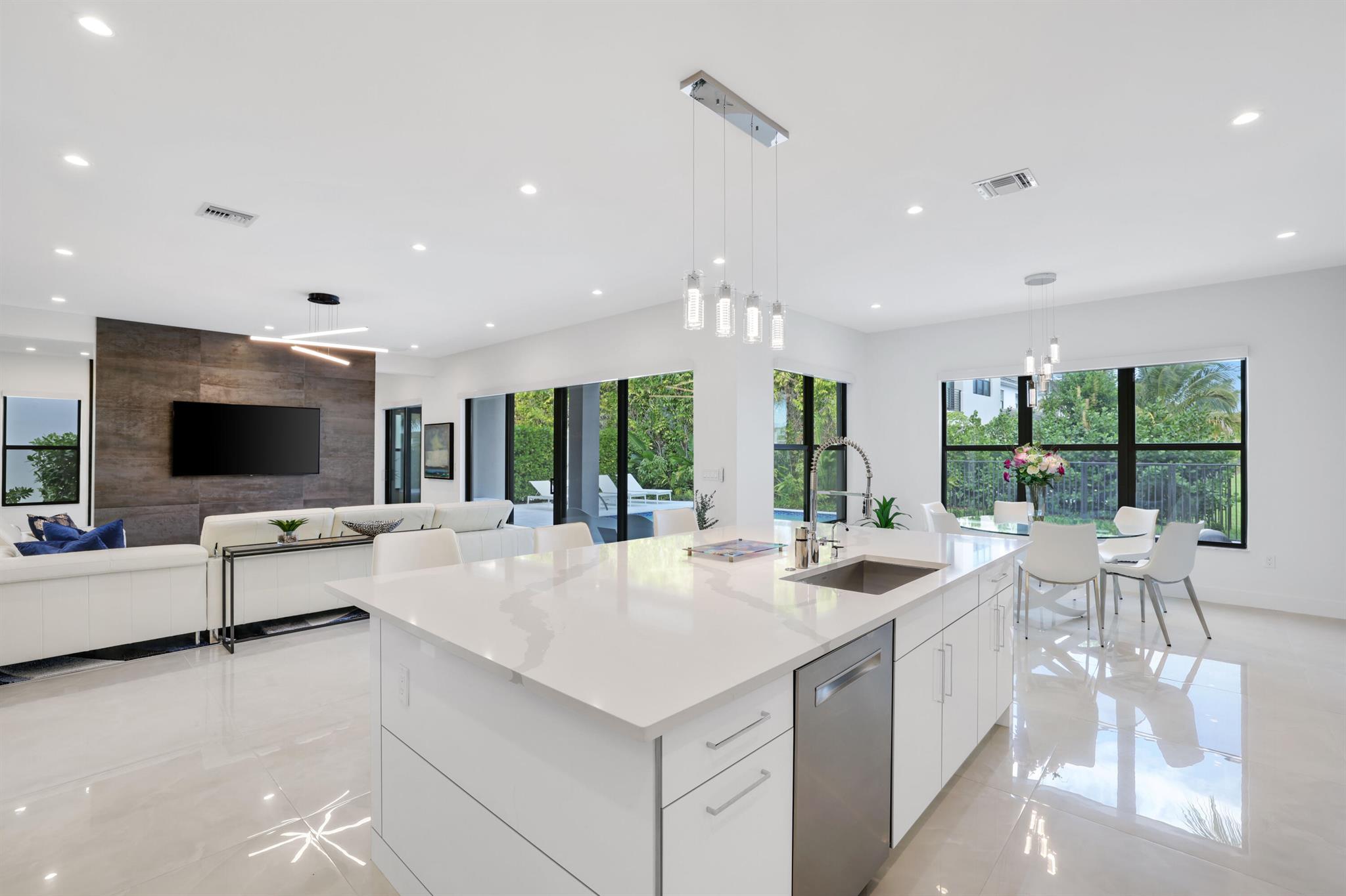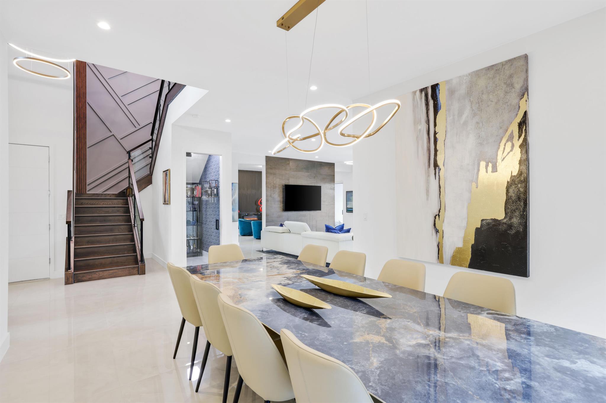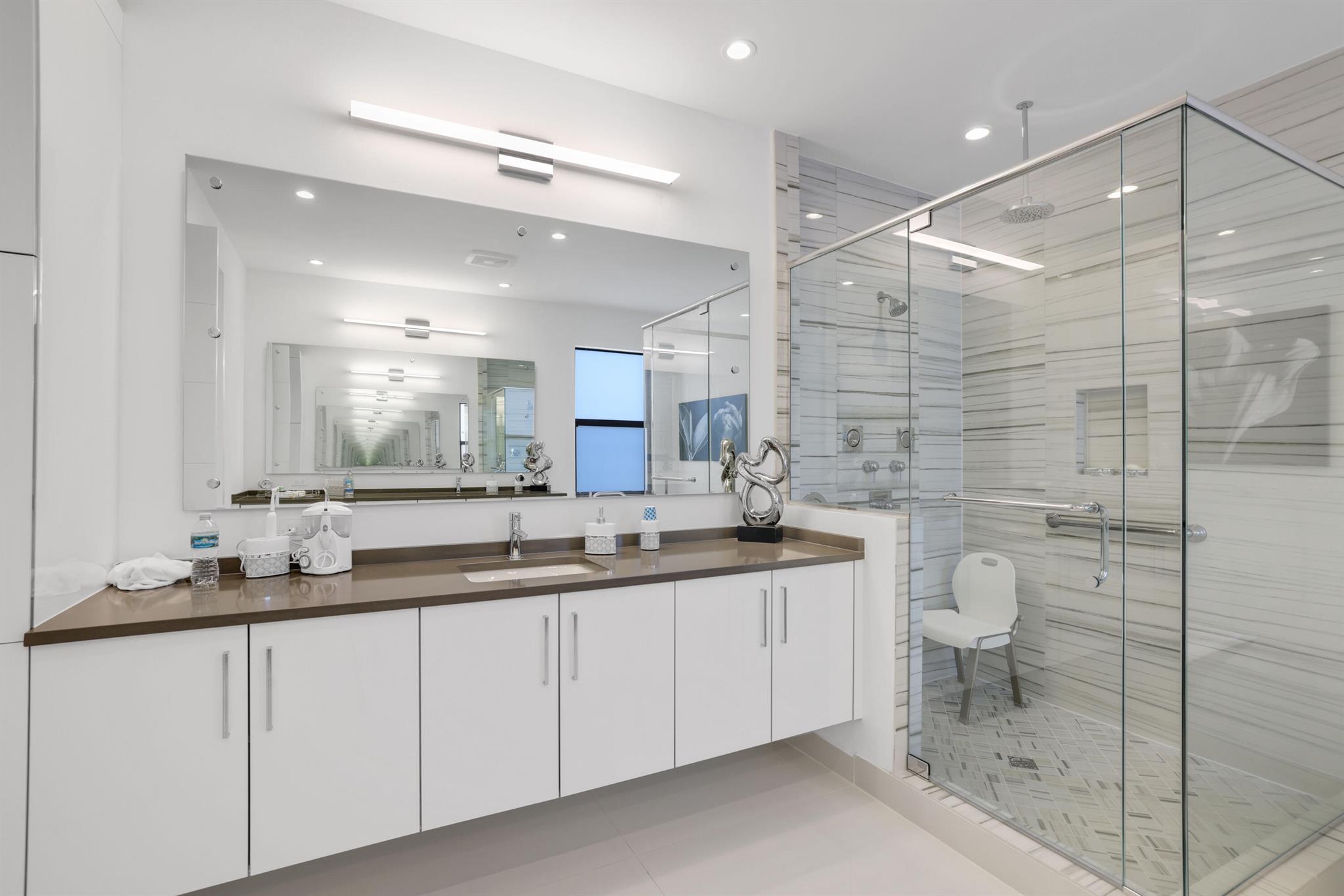 Turnkey luxury in Boca Raton's most prestigious community, the Maldives model in Lotus by GL Homes. This meticulously upgraded residence offers a total of 7,246 square feet with 5,378 square feet under air, featuring an array of premium finishes and smart design throughout. The gourmet kitchen showcases Wolf appliances, upgraded cabinetry, and a generous center island, while the first floor boasts Italian porcelain tile (4x4) and rich wood flooring upstairs. The spa-inspired master bath features a soaking tub and frameless glass shower, and contemporary details include a glass wall in the Club room, a glass door wine closet, and glass banisters. Electric shades throughout, upgraded light fixtures, and designer wallpaper and wall treatments complement the home's refined aesthetic.