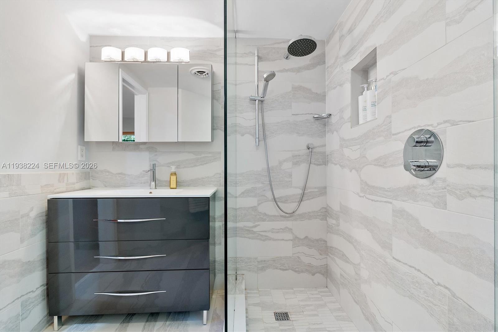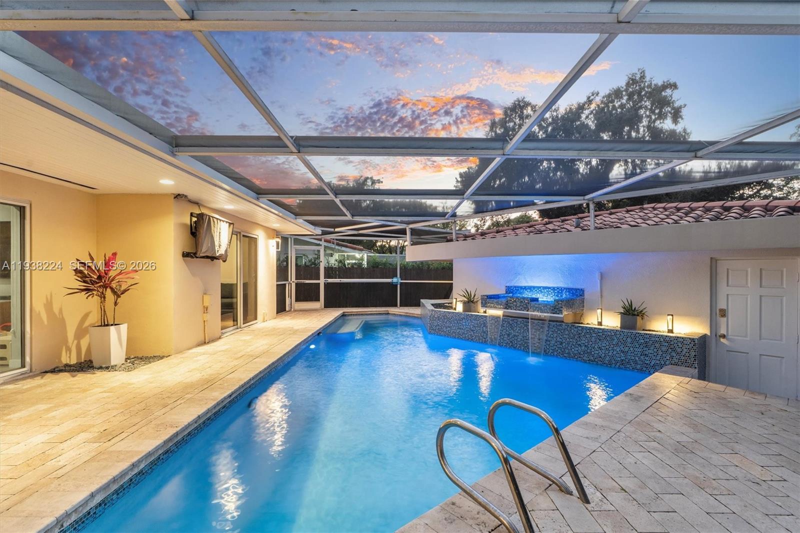 Beautifully reimagined Mid-Century Modern residence located in the highly desirable East Miami Shores neighborhood, just moments from Biscayne Bay. Set on an expansive 8,368 SF lot, this 3-bedroom, 3-bath home seamlessly blends classic architectural character with thoughtful contemporary updates. The light-filled interior features an open, flowing layout with updated flooring throughout, stylishly renovated bathrooms, and a modern kitchen equipped with premium appliances—ideal for both daily living and entertaining. Impact windows enhance comfort and peace of mind, while lush tropical landscaping surrounds the home, creating a sense of privacy and tranquility. Outdoor living shines with a screened-in pool patio designed for year-round enjoyment, offering a true resort-style atmosphere perfect for gatherings or quiet relaxation. A rear-entry two-car garage provides ample storage and presents flexible potential for a guest suite, home office, gym, or creative space. Ideally positioned near top-rated schools, Miami Shores Country Club, golf and tennis facilities, aquatic center, parks, and a variety of shopping and dining destinations—this home offers the perfect balance of luxury, lifestyle, and everyday convenience.