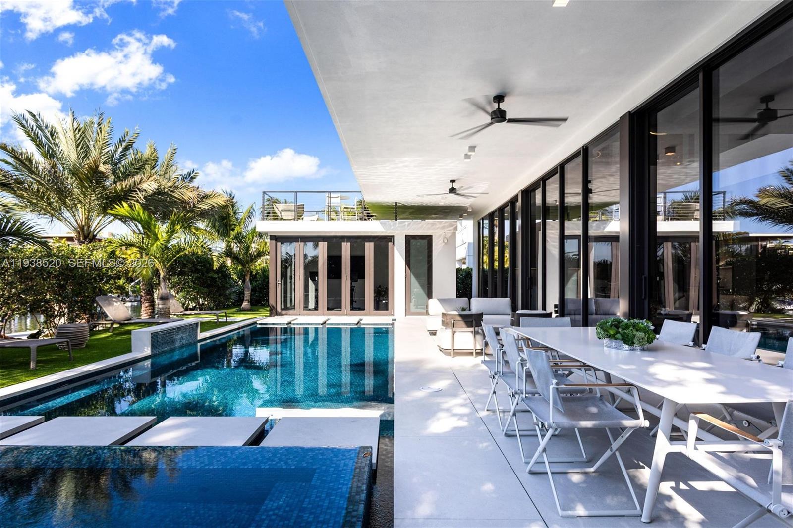 This expansive waterfront residence is located within the gated community of Keystone and offers approximately 6,700 square feet under air and 12,800 square feet total. Featuring 75 feet of direct water frontage with private dock access, the home is designed for both refined living and exceptional entertaining. Highlights include a dramatic double height living room with soaring ceilings, an impressive waterfront lounge terrace with sweeping views, a private putting green, a state of the art private gym, an entertaining game room, an elevator, and a dedicated home office. The residence includes seven luxurious bedrooms and seven full plus one half exquisitely appointed bathrooms. Italian millwork by Mia Cucina and furniture by Artefacto throughout complete this exceptional offering.