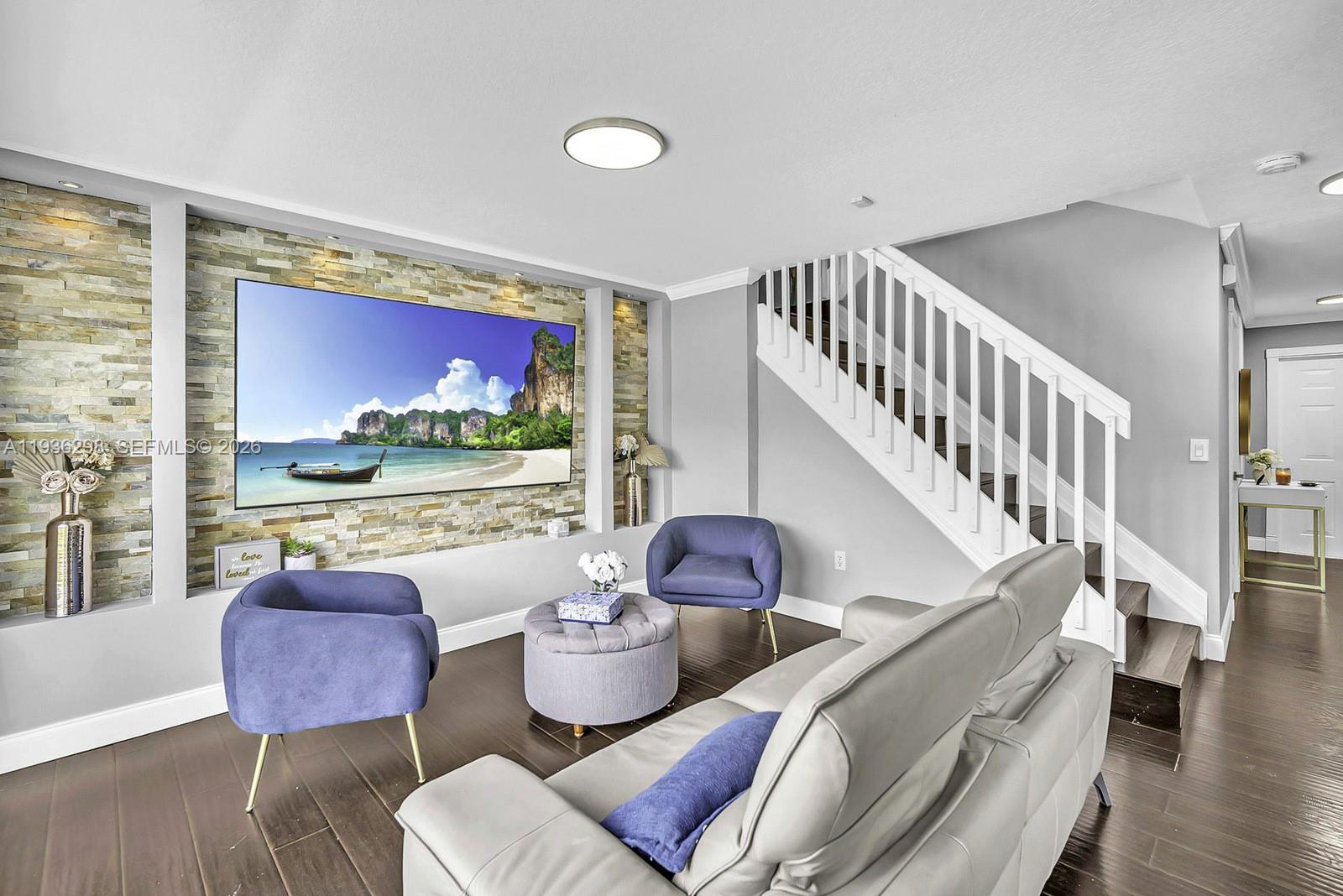 Spectacular fully re-imagined lakefront corner townhome located in the prestigious gated community of Pembroke Isles. Modern and beautifully updated 3 bedroom, 2.5 bath residence showcases laminate wood style flooring throughout, crown molding, a bright white kitchen filled with natural light, and stainless steel appliances. The family room is highlighted by an elegant decorative stone accent wall. Enjoy breathtaking sunrise views and tranquil lakefront living from your private back patio with no rear neighbors. Additional features include a 2 car driveway plus guest parking. Pembroke Isles offers resort-style amenities including a grand clubhouse, fitness center, multiple swimming pools, jacuzzi, tennis courts, pickle ball courts, basketball, soccer, racquetball, and more. No HOA approval required.
