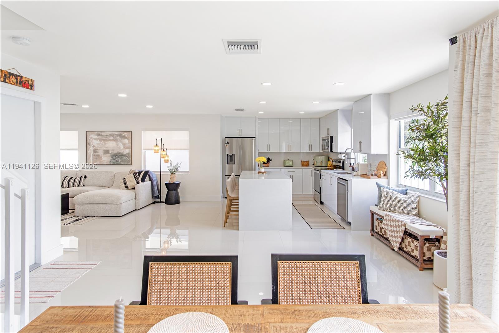 Lakefront luxury! This beautiful home in the Huntington community has been completely renovated. This modern oasis boasts remote control blinds, a beautiful kitchen with a quartz waterfall island, & porcelain tile throughout. Enjoy stunning views & bright spaces with dimmable lights. Features: stainless steel appliances, upgraded washer/dryer, impact door, & 2022 AC. Gated community with lakefront perks! Can be sold furnished.