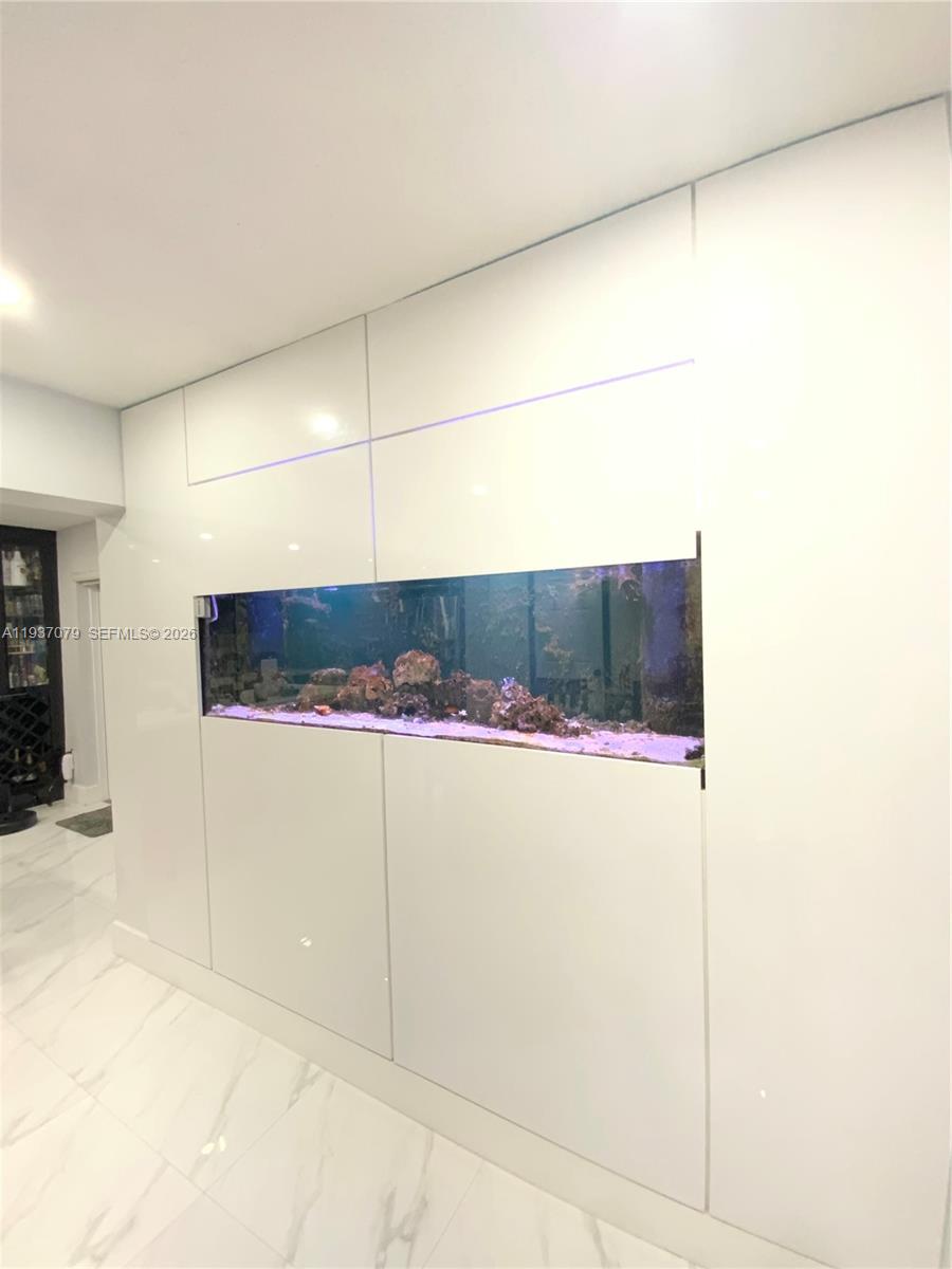 Located on a private street, this modern architectural gem was custom remodeled offering exceptional design, technology, and functionality unmatched in Miami Gardens, just minutes from banks, restaurants, major highways, Hard Rock Stadium, schools and Calder Casino. This unique home features wall-to-wall 18-inch white ceramic tile and a stunning chef’s kitchen with solid wood lacquer cabinetry, large granite island, stainless steel smart appliances, chef-grade stove with hidden spice storage, pantry, and indoor laundry. Designed for both entertaining and everyday comfort, the home includes extensive smart-home technology for lighting and appliances, built-in charging stations, security system, Tesla EV car charger, impact windows and doors, tankless water heater, and PVC fencing. A striking built-in wall aquarium with private service room anchors the open living, dining, and kitchen areas. The expansive entertainment lanai offers two separate gathering areas. A full outdoor kitchen with granite countertops for seating, grill, appliances, and a bar area, with exterior audio wiring. A cabana bath for outdoor use is a plus. The oversized backyard has room for a pool, includes a shed, and a pool table which conveys to the buyer. A large accessory dwelling unit (ADU) with private entrance and interior access features a living room, bedroom, walk-in closet, and full bath—ideal for guests or multigenerational living. With ample parking buyers will love this home!