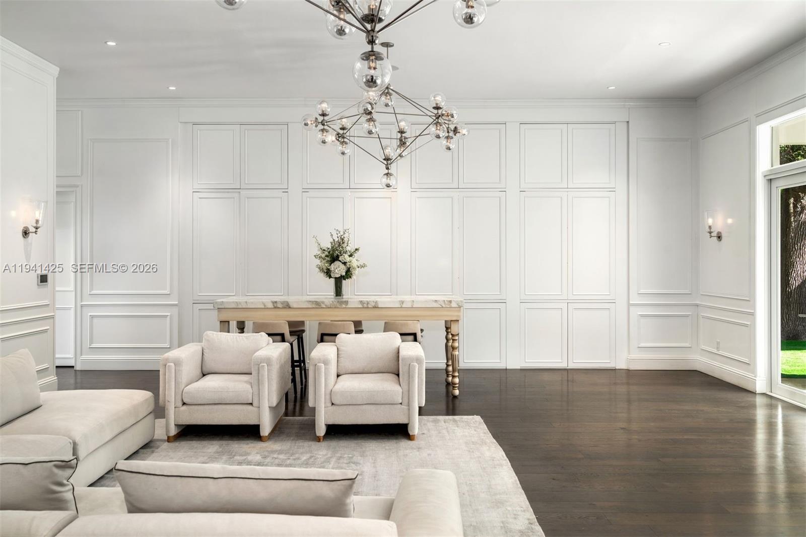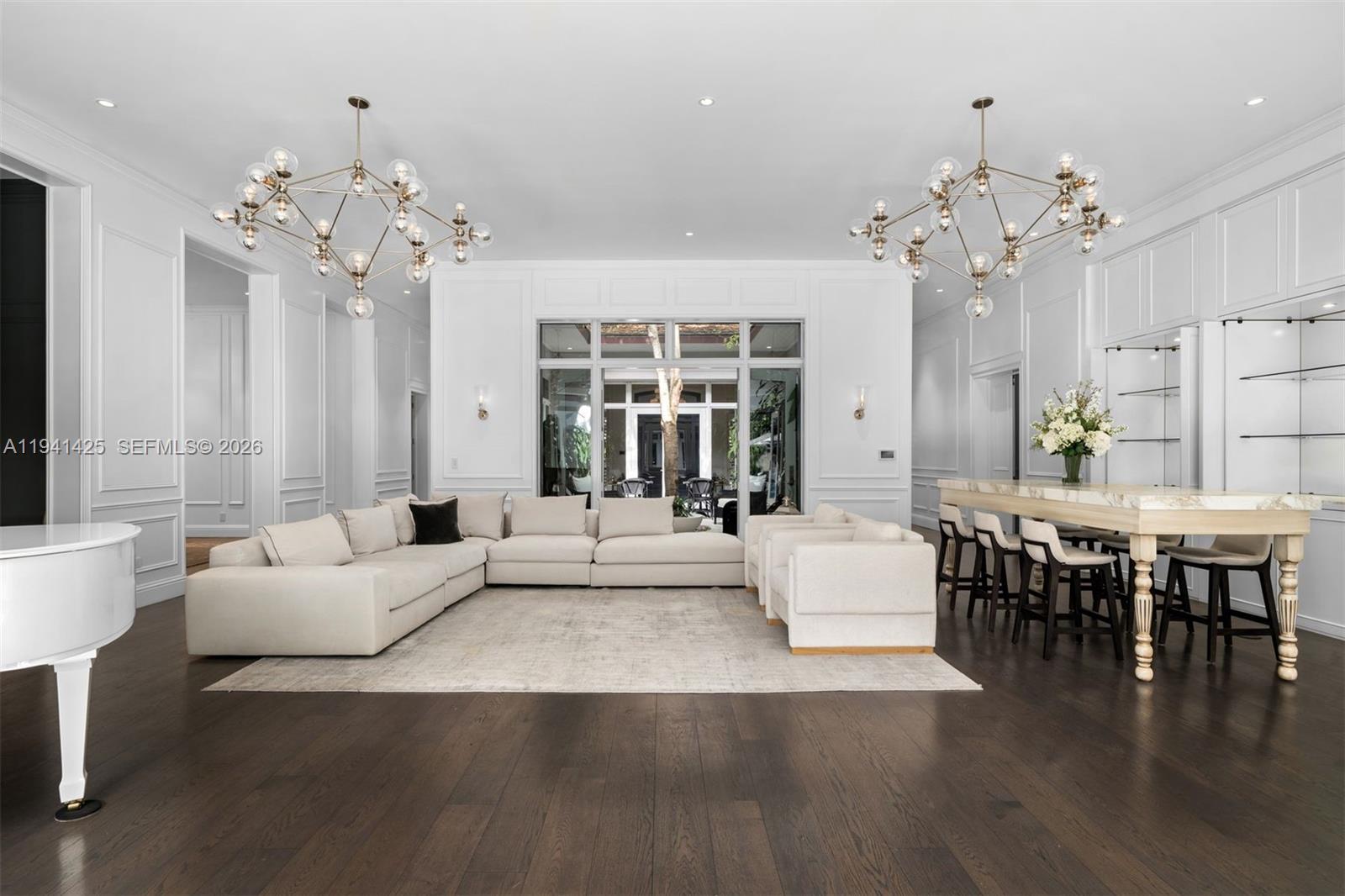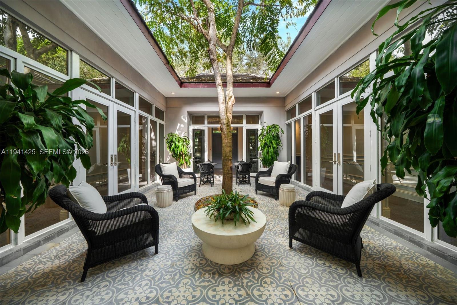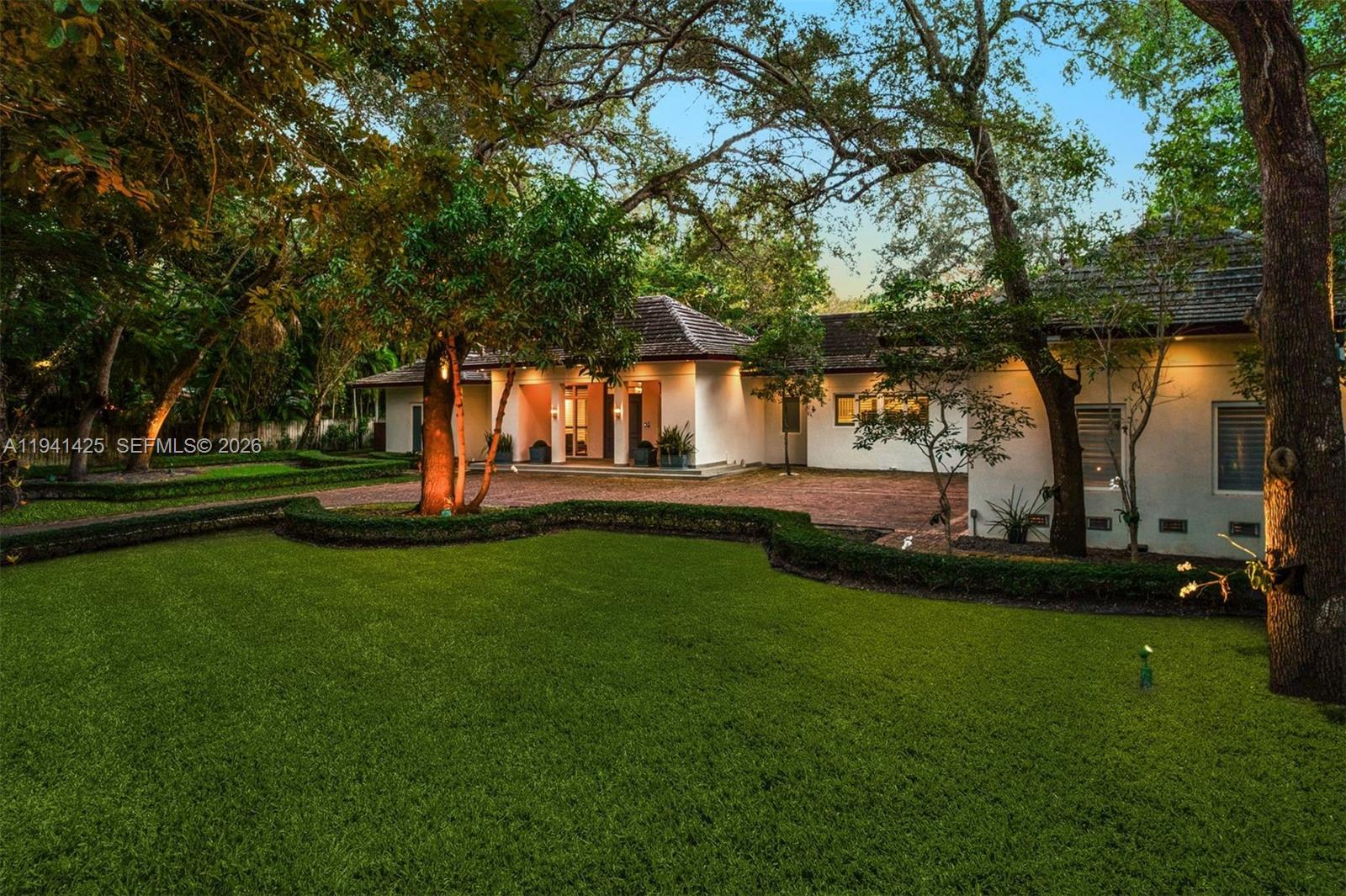 Set behind lush landscaping on approximately 1.1 acres in South Coconut Grove, this expansive one-story residence delivers 11,766 total SF with 6 bedrooms, 7 full bathrooms, and a powder room. Designed for comfort and effortless entertaining, the home showcases 12-foot ceilings, wide-plank wood floors, impact French doors, and refined architectural detailing throughout. Multiple living areas include formal and casual spaces, a wet bar, staff quarters, and a showpiece kitchen outfitted with custom cabinetry, quartz surfaces, a walk-in pantry, and a full set of premium Wolf, Sub-Zero, and Miele appliances. Two generous primary suites feature private sitting area, office, spa-style marble baths, and custom walk-in closets. The outdoor setting feels like a private resort, offering covered terraces, a heated pool, a separate oversized spa, half basketball court, volleyball court, outdoor entertaining areas, and a detached guest house currently configured as a gym. Additional features include a 4-car garage, whole-home generator, advanced smart home and security systems, and expansive grounds ideal for refined Grove living.