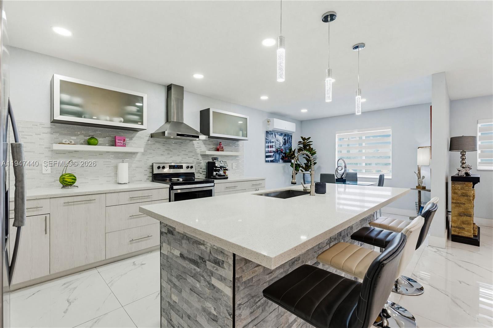 Beautifully remodeled single-family residence situated on an expansive 10,386 s/f lot. This inviting home features 3 spacious bedrooms and 2 fully renovated bathrooms across 1,580 total s/f. Recent upgrades include a brand-new roof, modern bathrooms, porcelain tile flooring throughout, and impact-resistant windows and doors. The private backyard is designed for both relaxation and entertaining, showcasing a sparkling pool, an outdoor kitchen, and a marble-finished terrace deck. The property offers generous side clearance on both sides, ideal for accommodating large boats, along with a grandfathered boat ramp and over-the-water deck foundation. Additional highlights include five energy-efficient mini-split systems, helping to significantly reduce electricity costs. Located in a family-friendly neighborhood just minutes from shopping centers and schools, this exceptional home blends comfort, functionality, and waterfront-ready living.