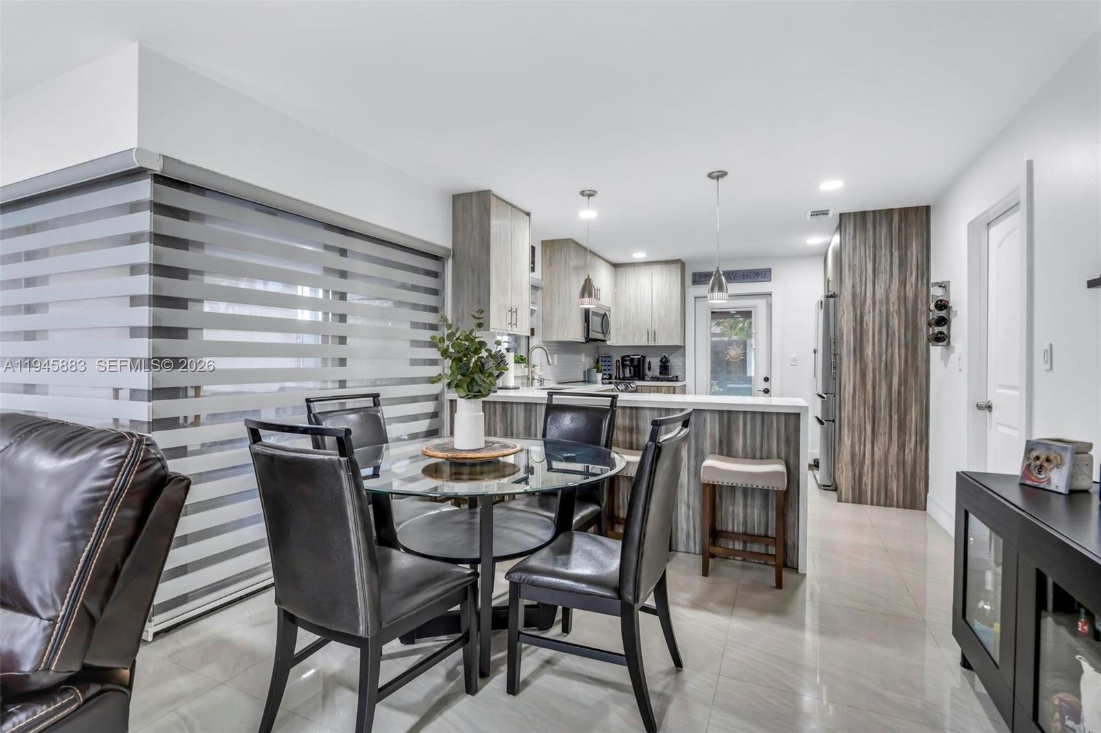 Fall in love with this beautifully remodeled, move-in-ready 3BR/2BA home, located in the welcoming and rarely available Woodgate community. The bright, modern kitchen features stainless steel appliances, quartz waterfall countertops, and an eat-in area, opening seamlessly to an inviting living space with 44"x31" tile flooring. Zebra blinds throughout bring in natural light while still offering privacy. This home features a split floor plan with the primary bedroom offering a recently remodeled ensuite and walk-in closet with direct access to the patio. Step outside to a private covered wrap-around patio complete with outdoor roller shades, slip-resistant tile, a TV, and additional storage, plus a separate storage shed making it perfect for relaxing or entertaining. Enjoy added peace of mind with an impact-rated front door and accordion shutters throughout the rest of the home. Centrally located and truly special, this is a must-see home with so much to offer! *Some photos have been digitally enhanced for marketing purposes