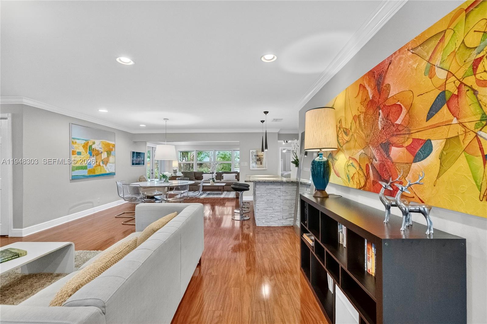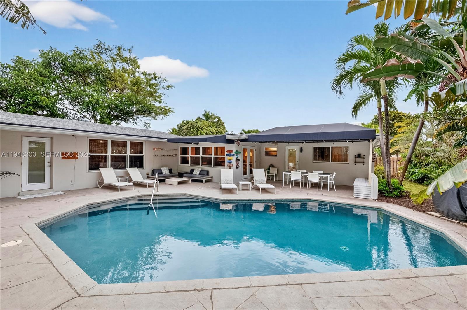 Impeccable 3-Bedroom, 3-Bath residence featuring two elegant primary suites, each with direct access to the poolside retreat. This beautifully maintained home showcases a gourmet kitchen with gas stove and wine cooler, along with expansive dining and living areas overlooking a stunning resort-style pool surrounded by lush tropical gardens, perfect for entertaining or everyday relaxation. Recent upgrades include a new roof, new driveway, and new pool water heater, while existing features include a saltwater pool system and all impact doors and windows, plus a garage for added convenience. Set on a generous corner lot just one mile from Commercial Beach, close to restaurants, cafés, and shopping. Offered furnished and equipped with a few exclusions. A rare opportunity, do not let it pass.
