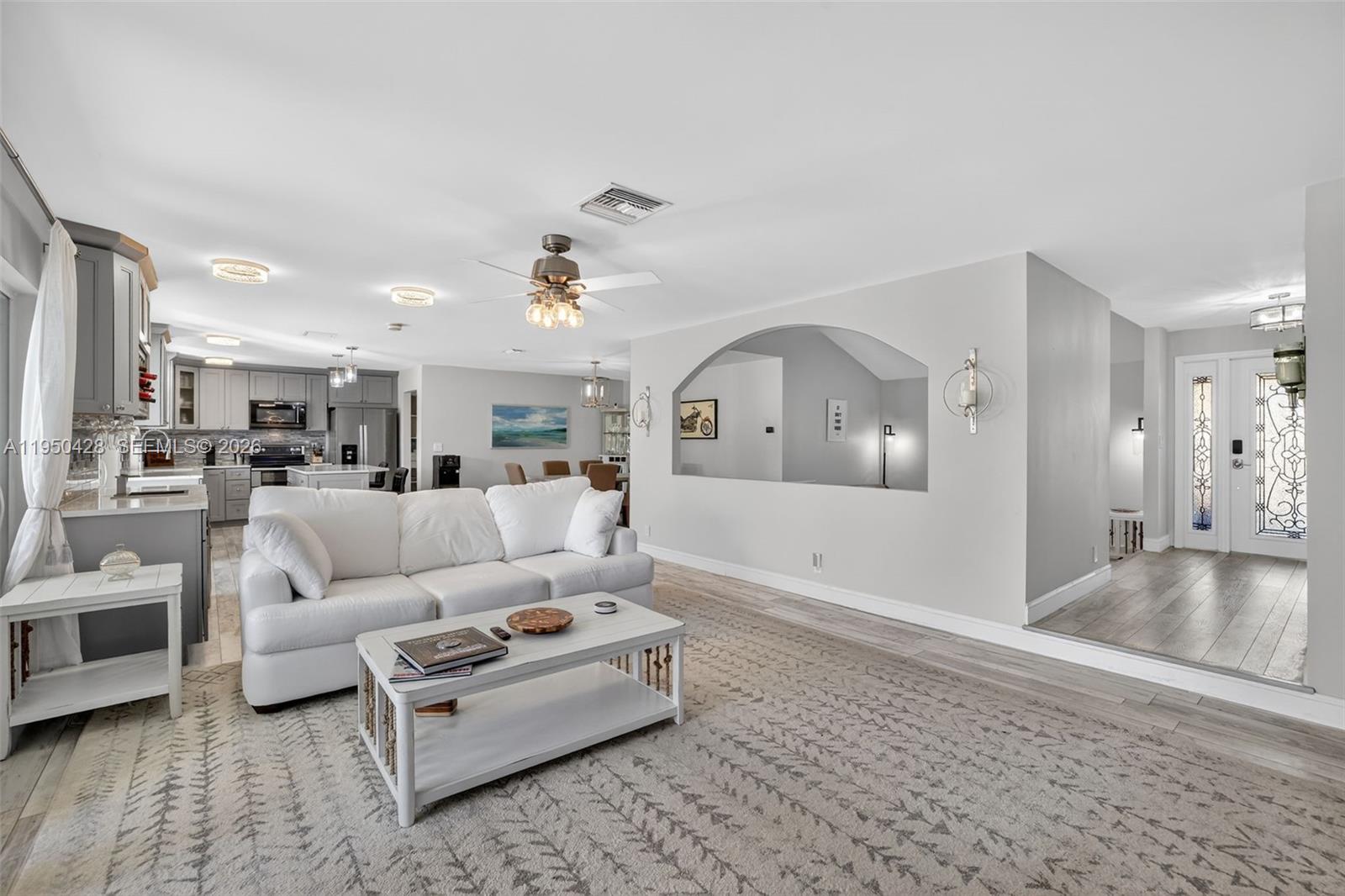 This absolutely stunning 3BR, 2BA waterfront residence offers bright, open living, tranquil lake views, & an exceptional poolside setting designed for everyday enjoyment. From the moment you enter, the home feels thoughtfully composed, with a welcoming foyer, vaulted ceiling lines, & clean architectural flow that naturally draws you toward the water. Expansive sliding doors flood the main living areas w/natural light, creating a seamless indoor-outdoor connection while framing peaceful lake views throughout. Open-concept living & dining spaces are anchored by a centrally located kitchen, allowing effortless flow for daily living or entertaining. The primary suite provides a comfortable retreat w/generous proportions & a beautifully finished bath, while additional BR’s are well-sized & versatile. Updated bathrooms feature modern finishes & walk-in showers, & a dedicated laundry room w/custom shelving adds a level of organization rarely found. Outdoors, the home truly shines w/a private backyard oasis featuring a saltwater pool overlooking the lake, complemented by expansive paver patios installed in 2024. A covered patio extends the living space, creating an ideal setting for relaxing, dining, or entertaining year-round. Smart home features, a new air conditioning system (2022), new garage door (2022), Complete Impact windows/doors, & a pool pump replaced in 2024 reflect the care given throughout. Impeccably maintained, this waterfront home delivers comfort, flow, & lifestyle.