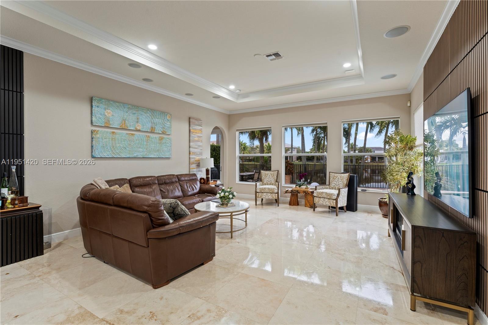 Gorgeous waterfront home with scenic views from every room! This modern waterfront 4BR/3BA residence in Heron Bay offers lake views from all main living areas. Built in 2014 with full impact glass and energy-efficient construction. Open split floor plan with 3-car garage and 3,024 SF interior. Polished 24" travertine floors, high coffered and volume ceilings with wide crown molding, and custom closet cabinetry, and copious recessed lighting elevates the interior with a rich atmosphere. Renovated kitchen features a large bar-style island, high-level counters, gas cooking, wall oven, microwave, pantry, and natural gas appliances; kitchen opens seamlessly to the family room. Primary suit includes neutral Berber carpet, an oversized walk-in closet, dual sinks with expansive vanities, separate tub and shower. Outdoor living includes a heated 15x30 saltwater pool, screened patio, exterior lighting, fenced yard, and north-facing rear exposure for consistent natural light. For even more premium finishes, this residence includes plantation shutters, honeycomb blinds, a laundry sink, impact doors, an auto-sprinkler system, a leased security system, and an automatic garage door opener. CBS construction with flat tile roof. Heron Bay amenities includes a clubhouse, fitness center, pools, tennis, and guard-gated entry. Zoned for highly rated schools Heron Heights, Westglades, Marjory Stoneman Douglas.