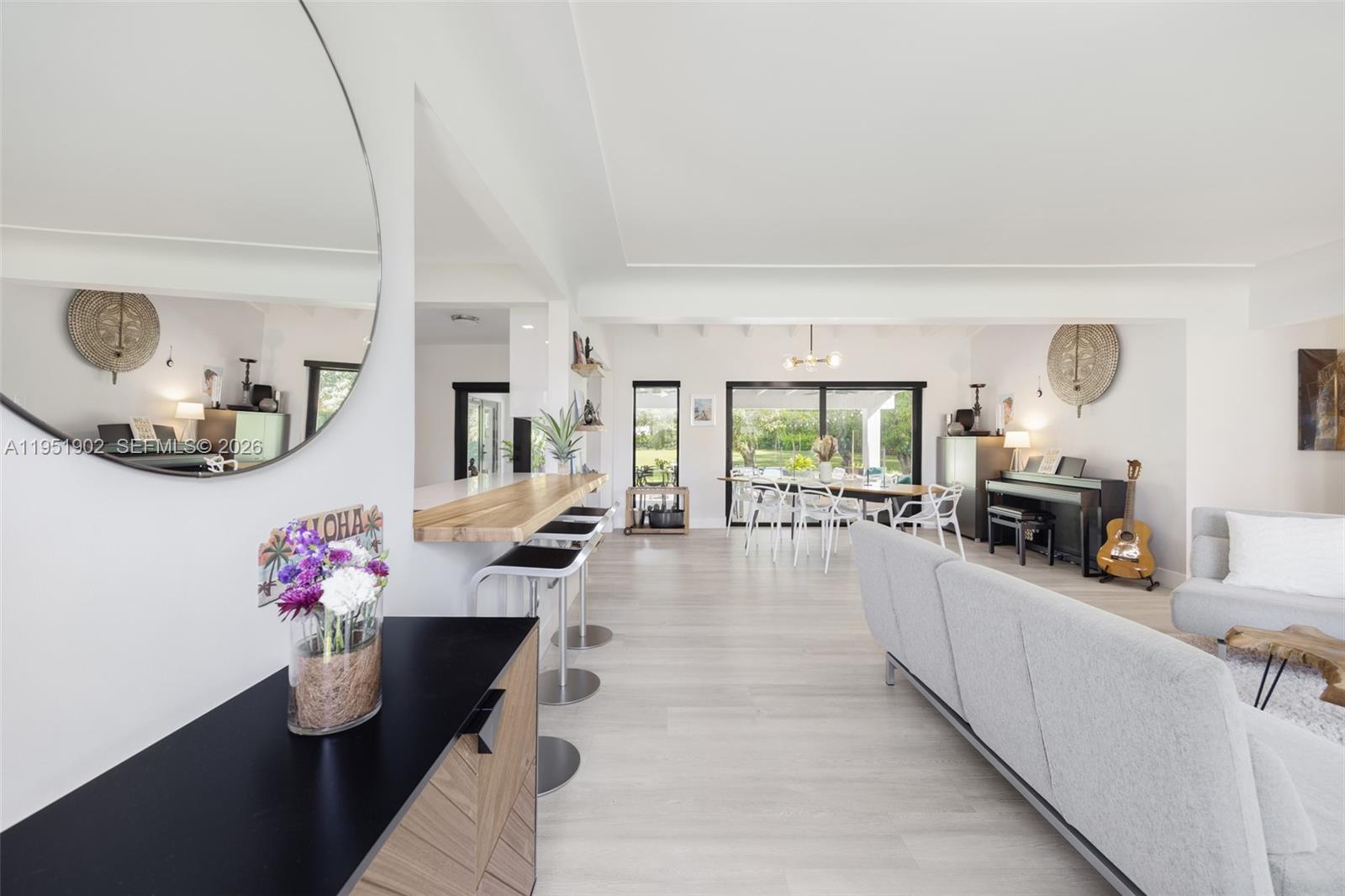 Set on over an acre in prestigious North Pinecrest, this light-filled home offers open-concept living and dining areas with smooth indoor-outdoor flow and expansive backyard views. The kitchen features a bar-height counter with seating and modern finishes throughout. A spacious primary suite includes a dedicated office nook, perfect for working from home. Located in the highly sought-after Pinecrest school district, this home combines comfort, flexibility, and future potential in one of Miami’s most sought-after neighborhoods. A full set of floor plans and thoughtfully designed renderings for potential updates are available upon request.