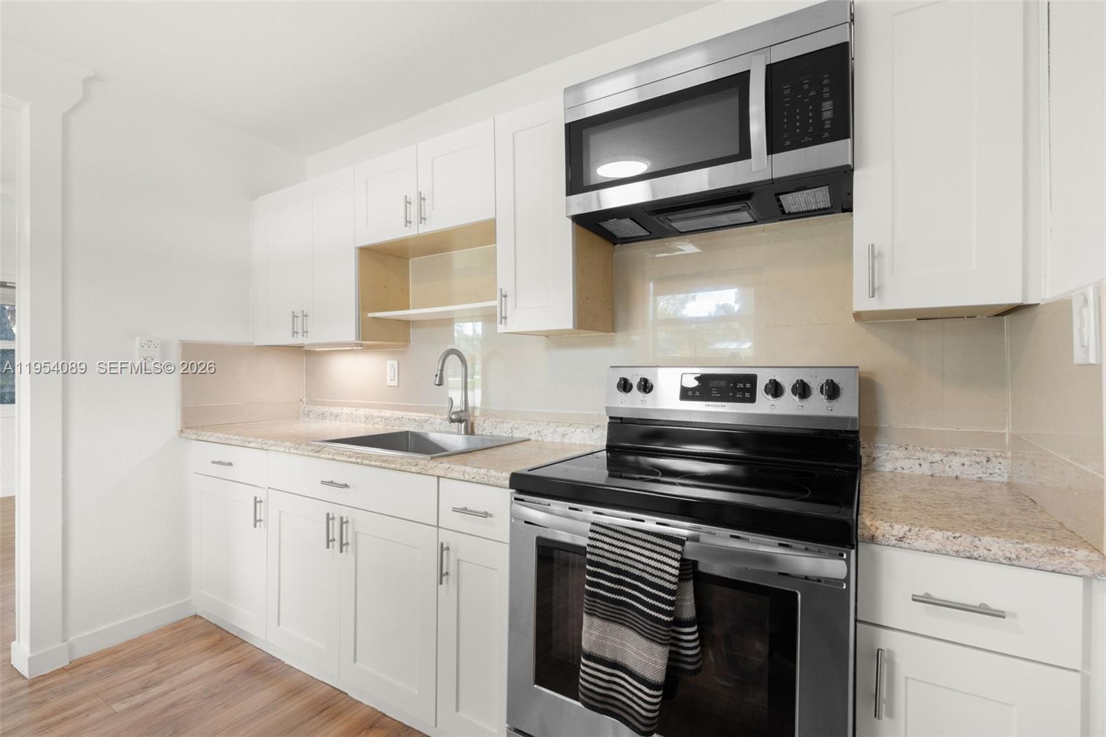 This is a great starter home on huge FULLY FENCED corner lot. Updated 2 bedroom / 1 bathroom with HURRICANE IMPACT WINDOWS. Kitchen has white shaker cabinets with stainless steel appliances and laminate counter tops. Refrigerator is less than a year old. The bathroom is light and bright with a tub/shower combination. Laminate flooring throughout. There is a NEST thermostat and RING doorbell at the front door. Enjoy the view of the lake, located across the street, while in the living room and kitchen. There is also a children's playground across the street as well. The neighborhood has sidewalks for added safety. Utility closet has newer Samsung front load stackable washer and dryer. Tankless hot water heater assures you you'll never run out. There are two separate driveways, one of which is covered and inside the gate of the fenced yard. You'll also enjoy the huge workshop in the backyard with electricity. Plenty of room for your tools, mower, motorcycle or other hobbies. Sprinkler system is on well water and inside the house is city water. This home is on a septic tank with a new drain field. Roof is approximately 9 years old and AC is approximately 8 years old. This home is just a few minutes to Davie Road near Broward College, FAU, Nova Southeastern, and other schools. Plenty of shopping and restaurants nearby. Easy access to the Turnpike, I-595, I-75.