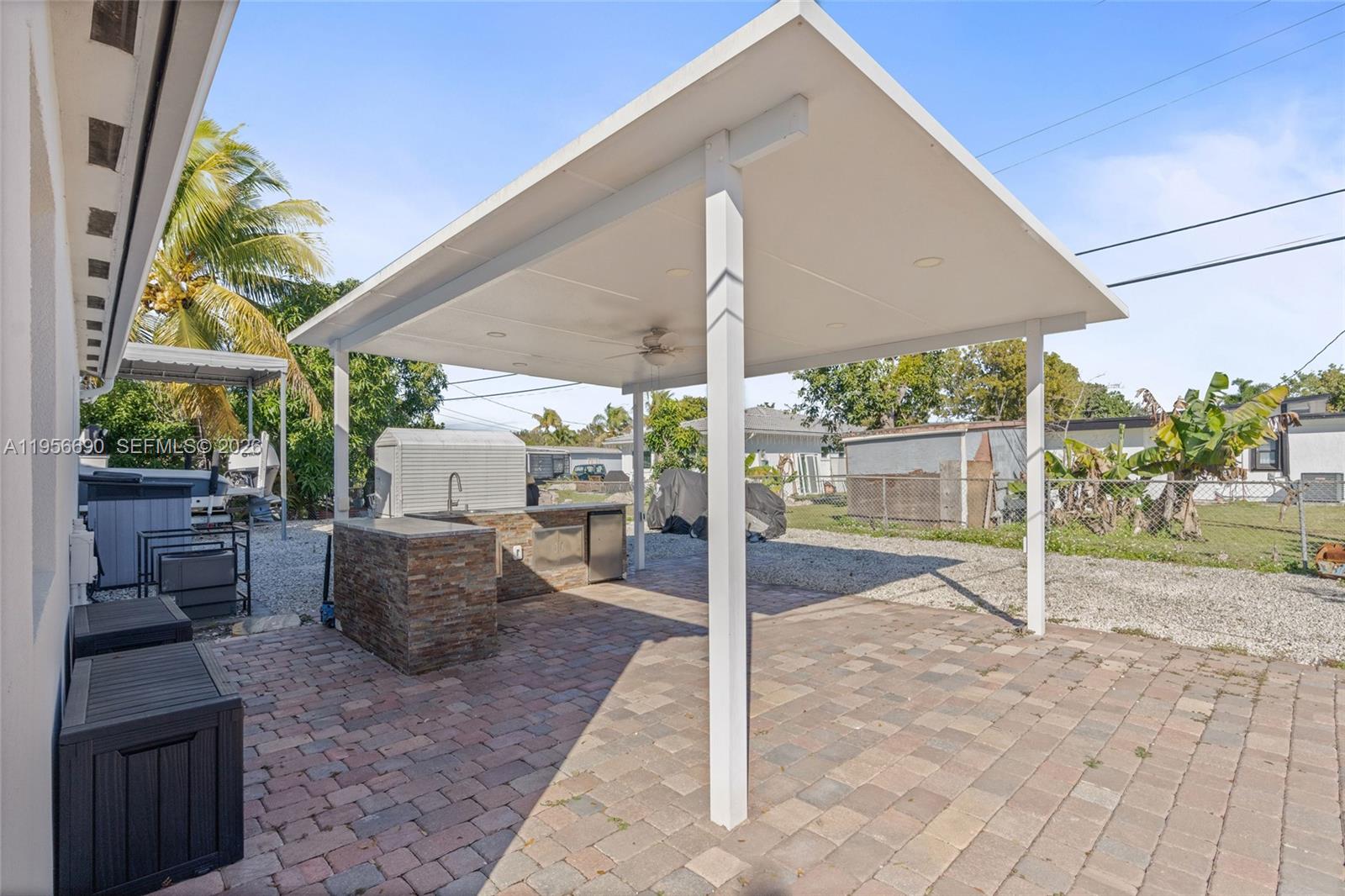 Discover this beautifully maintained 3-bedroom, 2-bath home that truly stands out. Built in 2013, making it one of the newer construction homes in the area and built under current building codes, this move-in-ready property features engineered metal roof trusses along with hurricane-impact windows and doors for peace of mind. Step inside to a freshly painted interior with high ceilings, LED lighting, ceramic tile flooring throughout, and newly installed baseboards, creating a bright and modern feel from the moment you walk in. The laundry area includes a stacked washer and dryer for added convenience. Out front, the impressive 2,000+ square-foot paver driveway offers exceptional parking space, perfect for multiple vehicles and guests. The fully fenced backyard is designed for entertaining and relaxing, featuring a beautiful paver area, a pergola, and a custom outdoor kitchen complete with a mini fridge, sink, and LED lighting, ideal for gatherings and weekend enjoyment. Additional features include an 11.5 x 30 fenced-in carport ideal for boat or RV storage and a 6x12 storage shed. The septic tank was serviced and pumped in 2025. All improvements were completed with permits and are legal, with no violations. No HOA. Conveniently located near major highways, approximately 20 minutes to Brickell and Downtown Miami and about 25 minutes to Miami Beach. Priced to sell and an absolute must-see, this home offers the perfect blend of comfort, style, and location. Great for families!