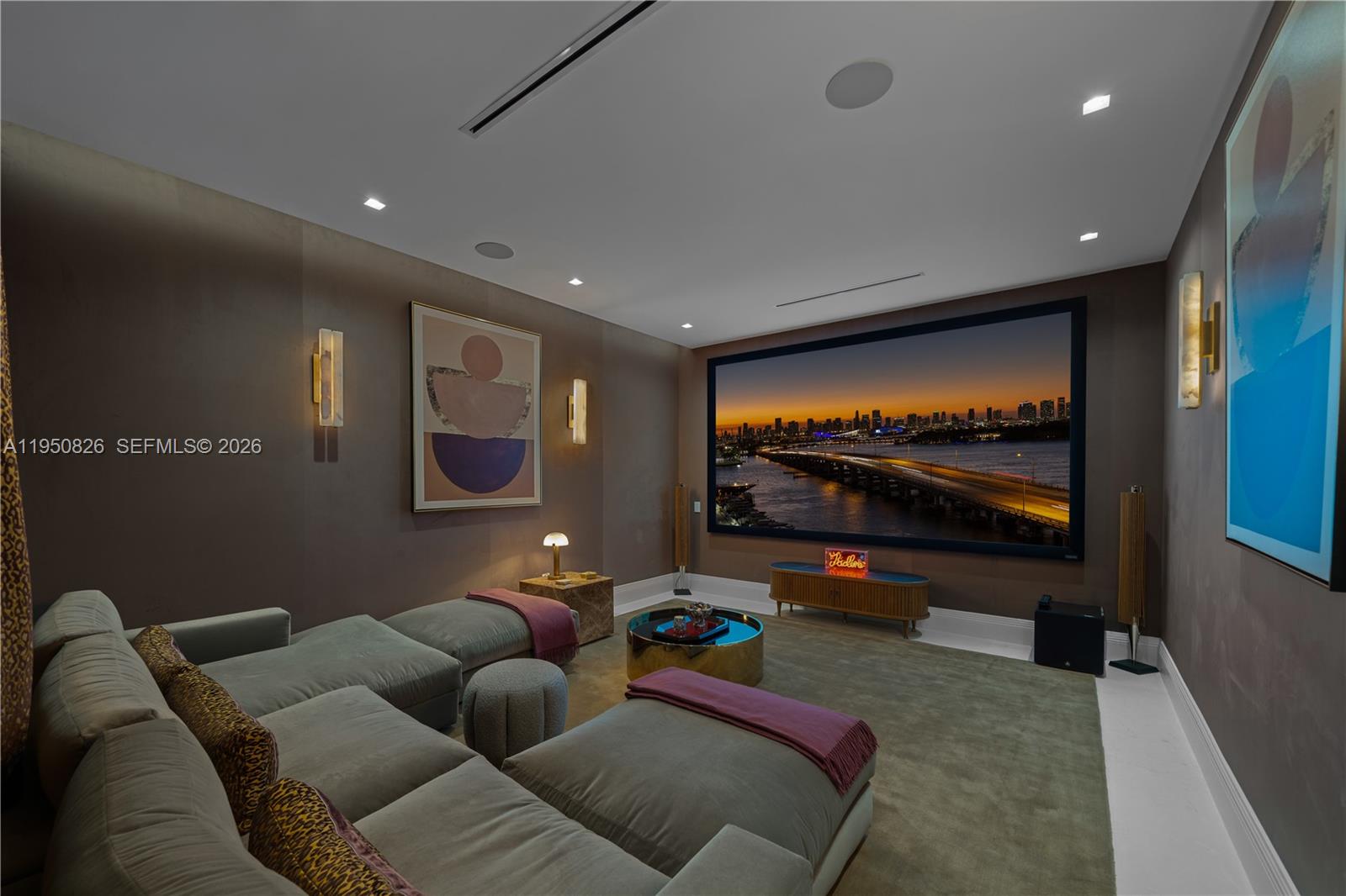 MODERN WATERFRONT RESIDENCE FEATURING CURATED LUXE INTERIORS SITTING ON THE OPEN BAY + CITY VIEWS ON THE EXCLUSIVE VENETIAN ISLANDS BY STRANG DESIGN! 5 beds + double offices & theater, 5 full baths + 2 powder rooms spanning 8,048 Adj SF living area on a 13,382 SF LOT w/ 104 FT of waterfront. Dramatic double-height entry & entertaining areas feature 25’ ceilings w/ custom Bocci chandelier & Nella Vetrina Italian doors + custom hidden bar. Chef’s kitchen w/ Wolf appliances, including gas range, double oven & coffee station. Sub-Zero fridge & wine storage. Ground-floor office, convertible to a bedroom, wrapped in Phillip Jeffries wallpaper + floor-to-ceiling built-in bookcases. Theater w/ State-of-the-art AV system featuring Bang & Olufsen surround sound system, Sony 4K HDR projector + separate wet bar & fridge. Primary suite w/ private terrace overlooking the Bay & City lights. Dedar wallpaper + dual walk-in closets. Primary bath w/ double vanity & electric frosted smart glass for privacy. Gym w/ PENT Equipment. Expansive Outdoor area w/ infinity-edge pool, outdoor kitchen w/ gas range + ipe dock. Rooftop terrace w/ open views of Miami and the Bay w/ storage & drink fridge. Smart Home technology includes Control4 automation, Sonos, Lutron lighting & fully motorized blackout shades in bedrooms & common areas. Fully secured w/ a wired alarm system, leak detection, a multi-camera security system & a whole-home gas generator. Gated Driveway for up to 4 cars + 2-car garage.