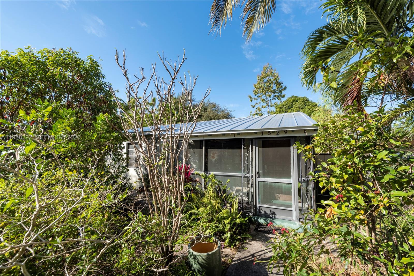 Ideally located in Fort Lauderdale, just steps from Wilton Manors main street. Single family house, 2 bedroom and 1 full bathroom with brand new metal roof (2025) thoughtfully designed with sustainability in mind. The front and back gardens feature native plants and mature trees that conserve water while supporting the local natural environment. A charming covered front porch offers the perfect spot to relax and enjoy peaceful views of the quiet street. The expansive backyard is open, inviting, and immersed in nature, providing ample space to create your own outdoor retreat—whether that includes a tranquil pond, elegant fountain, or a future pool.