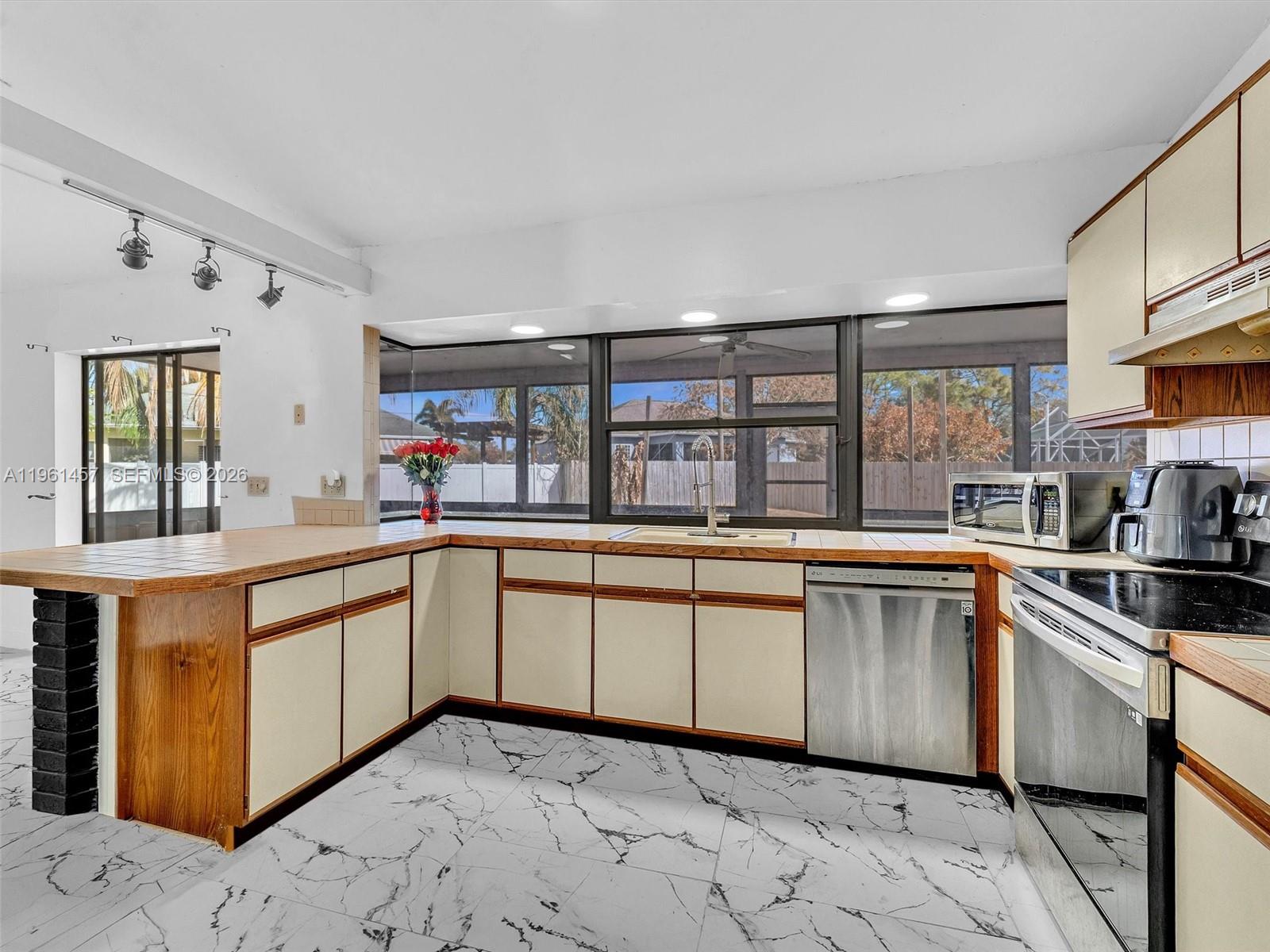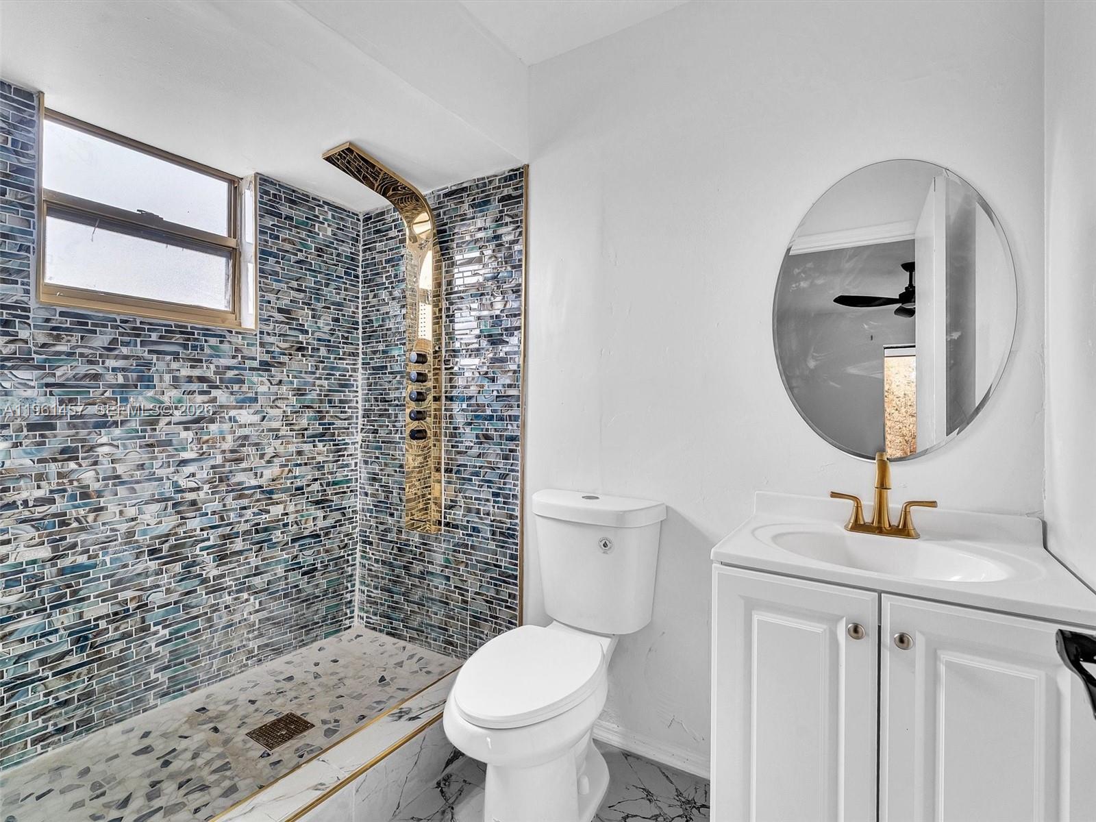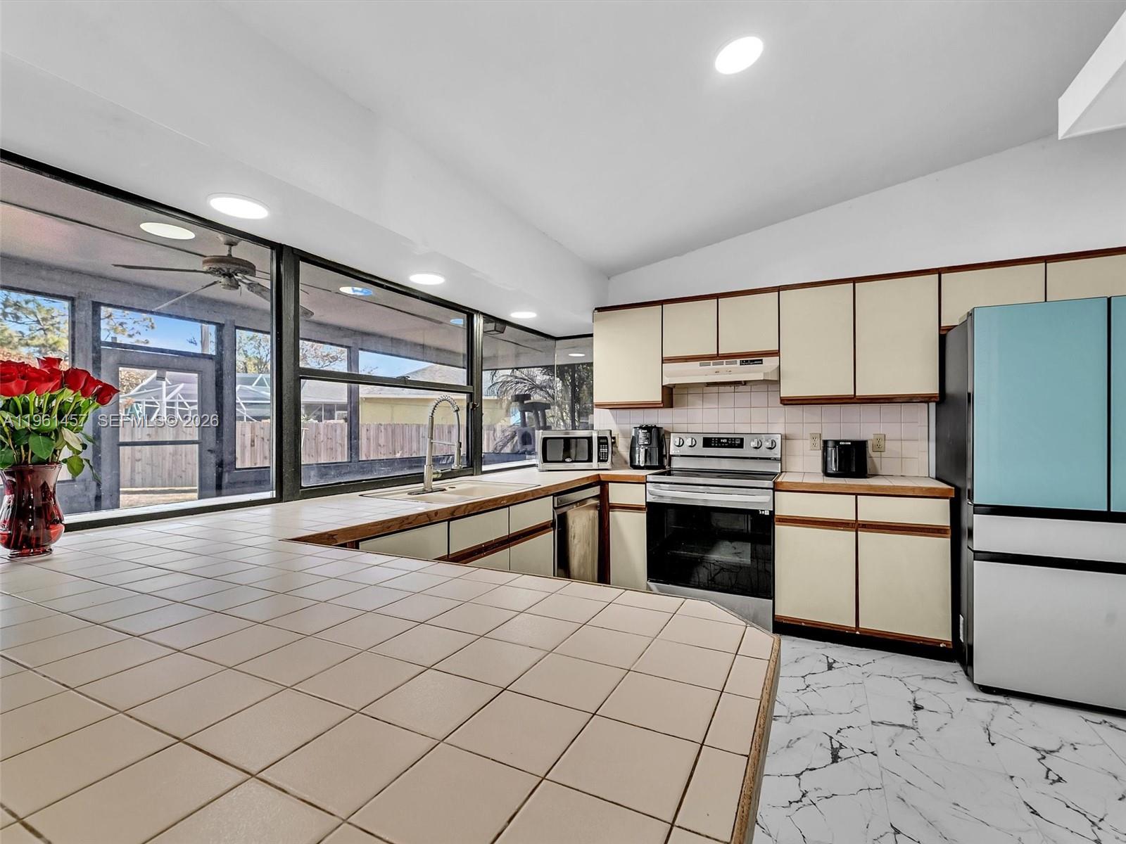 Incredible opportunity to own this charming 2 bedroom, 2 bathroom home on a spacious corner lot located in the heart of Port St. Lucie. This pristine property was recently renovated with porcelain tiles throughout and updated master bathroom. An open kitchen, adjacent to a large dining room, with a new Samsung refrigerator and garbage disposal, recently installed. A split bedroom layout with spacious walk-in closets and plenty of storage room. The fencing was just replaced along with a new flat roof. It features an oversized covered patio with a pass through bar top, giving you that great feeling for relaxation and entertaining your family and friends.