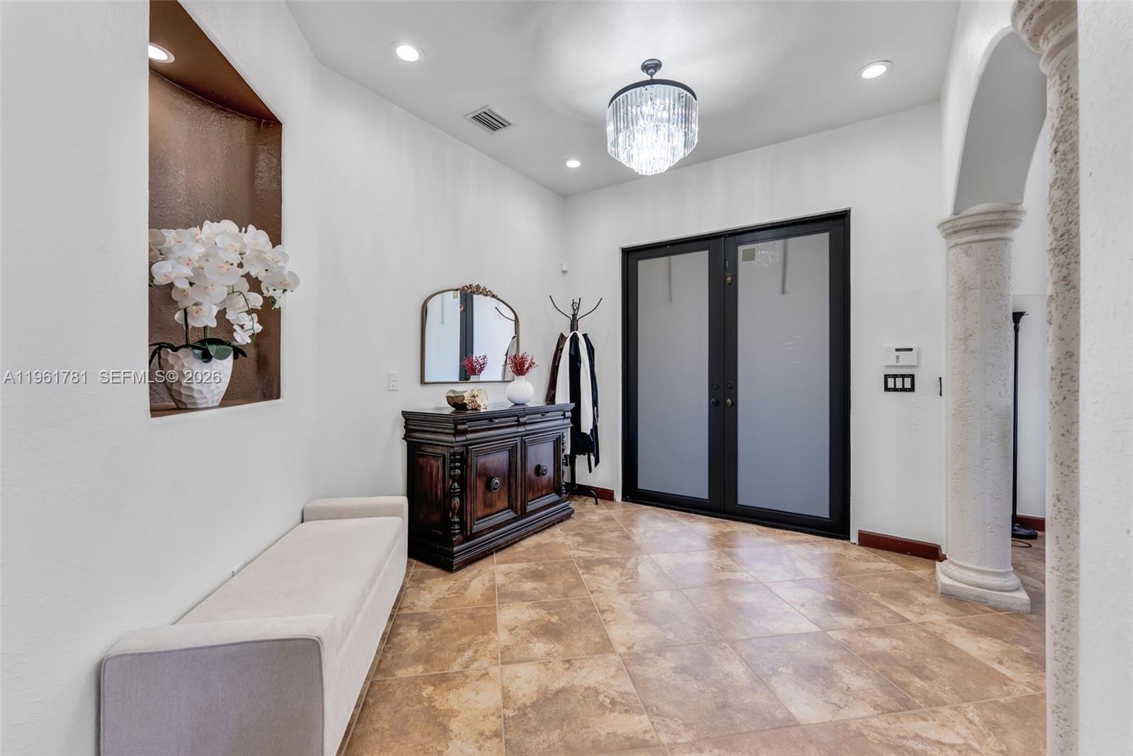 Welcome to this elegant residence featuring an electric gate and a grand circular driveway, plus additional side parking accommodating up to 7 vehicles and ideal for an RV or boat. The travertine driveway leads to a 2-car garage with custom organizing shelving walls. Hurricane shutters and an impact glass front door offer peace of mind, while manicured landscaping and an elegant front entryway are highlighted by a beautiful water fountain. The property also provides space for a future pool. Inside, the home showcases a tastefully upgraded kitchen with Café stainless steel appliances, zebra blinds throughout, tile flooring upstairs, and a hardwood staircase accented by a wrought-iron banister. A Jack-and-Jill bathroom adds convenience, and the home is offered furnished. The primary suite features an oversized walk-in closet and a spacious bath with dual sinks and a separate soaking tub and shower. Outdoor living includes a pavered back patio and a dedicated patio area perfect for enjoying morning coffee. Ideally located just minutes from I-75, offering privacy, luxury, and convenience.