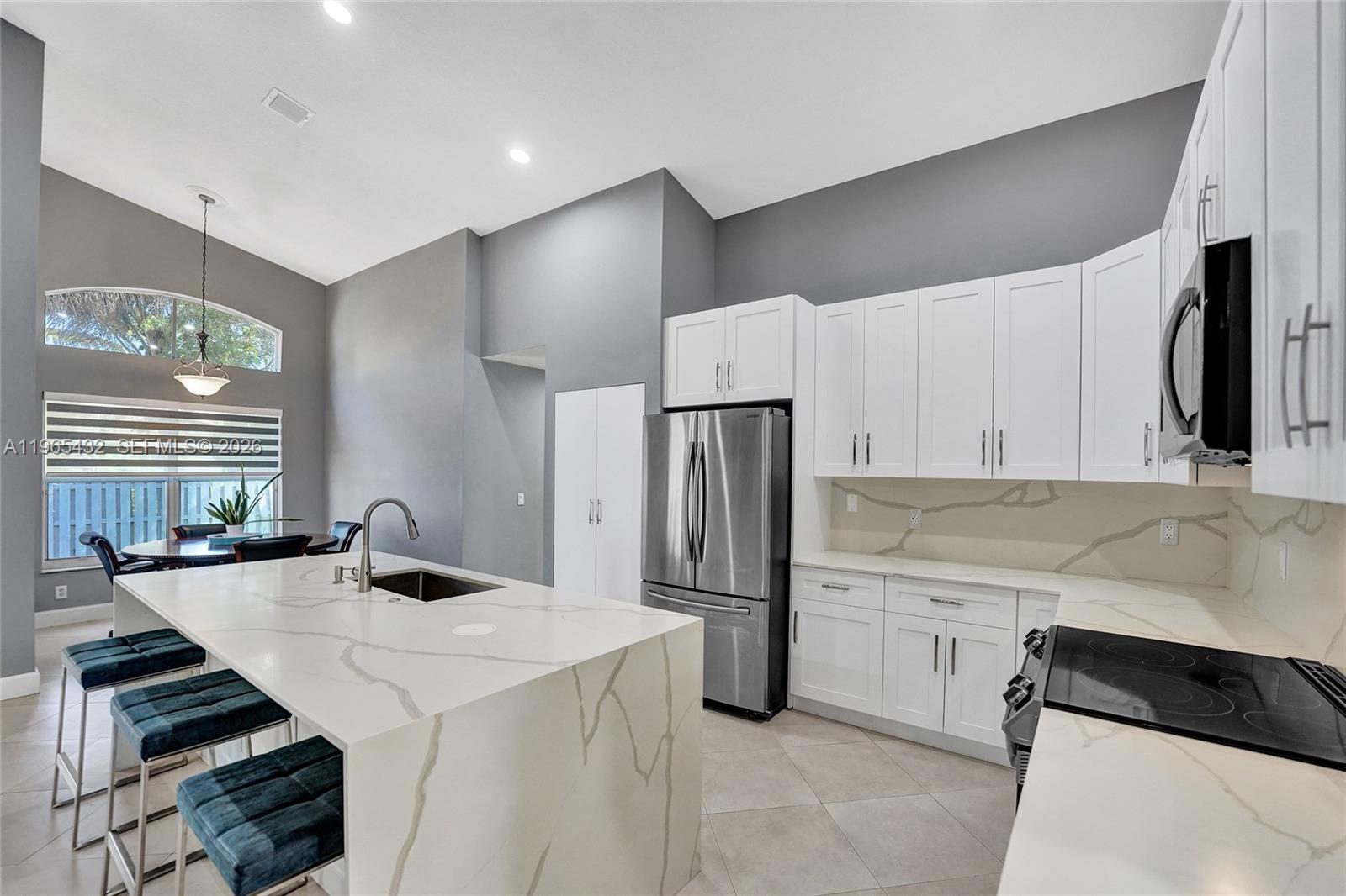 Immaculate 4 bed plus den, 3 bath single-family home in 24 hour guard-gated, resort-style community Encantada in Pembroke Pines. Features paved circular driveway, completely updated kitchen with quartz waterfall island, quartz backsplash, stainless steel appliances, vaulted ceilings, zebra blinds throughout, cabana bath, newer roof, spacious ensuite primary, new led ceiling fans throughout and much more. The community features a lakefront resort-style pool, clubhouse with social room, fitness center, kids park, full court basketball, pickle ball, tennis and volleyball.