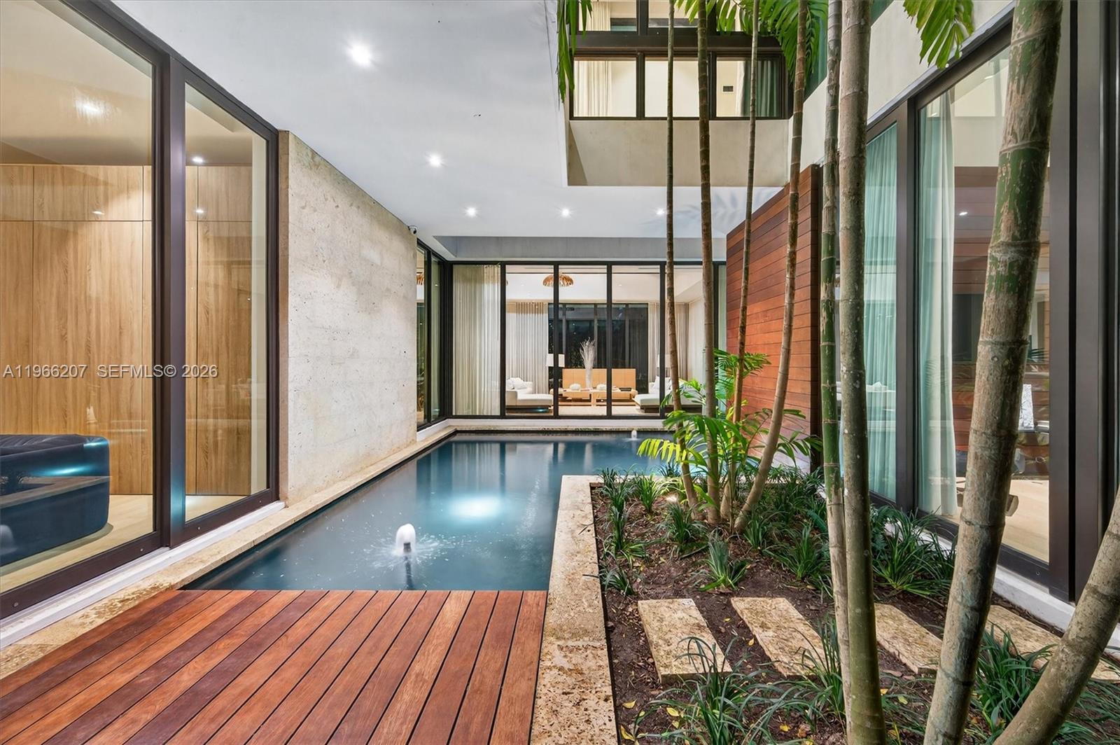 2300 Sunset Drive is a tropical modern six-bedroom, eight-bathroom home on Sunset Island 3 in Miami Beach — one of only two guard-gated island communities you can actually walk from to great restaurants and boutiques. Set on a 13,500-square-foot lot, this move-in ready residence blends clean architecture with warm, organic finishes and effortless indoor-outdoor living. All six bedrooms are en suite, and every bathroom is wrapped in floor-to-ceiling marble for a true spa feel. White oak floors run throughout, and the chef’s kitchen is equipped with premium Miele appliances. Walls of glass overlook lush tropical landscaping and tranquil water features, giving the entire home a five-star resort vibe reminiscent of Aman or Four Seasons. The pool wraps around the house, creating a dramatic, resort-style setting that connects every space. Two expansive private sun decks, a built-in barbecue, and a natural keystone patio and driveway complete the outdoor experience. With so many indoor and outdoor spaces surrounded by water and glass, the home feels like a true architectural showpiece. And the real luxury? Security and privacy. Living on a guard-gated island means peace of mind — while still being right in the center of Miami Beach. It feels like your own private tropical island, just minutes from everything.