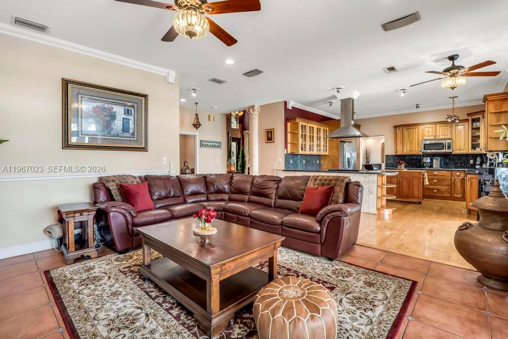 Don't miss out on this opportunity to have a home on one of the largest lakes! Beautiful two-story lakefront home located in the prestigious gated community of Sunset Isles in Silver Lakes. This spacious residence features 4 bedrooms and 4.5 baths, including a full bedroom and bath on the main floor, perfect for guests or multigenerational living. Upstairs offers three additional bedrooms, including the primary suite, plus a versatile loft area. The primary suite boasts a large private balcony overlooking expansive lake views, creating the perfect setting for spectacular sunsets. The main level includes a half bath for guests, a gourmet kitchen with an eat-in nook that opens to the family room, and leads out to the pool area. Formal living and dining rooms also feature French doors that open to the beautifully landscaped backyard. Enjoy outdoor living with a large covered patio, resurfaced pool (2023), and breathtaking lake views ideal for entertaining. Additional features include accordion shutters throughout, a durable metal roof with over 20 years of life remaining, and an oversized two-car garage with ample storage. A perfect blend of comfort, space, and stunning waterfront views.