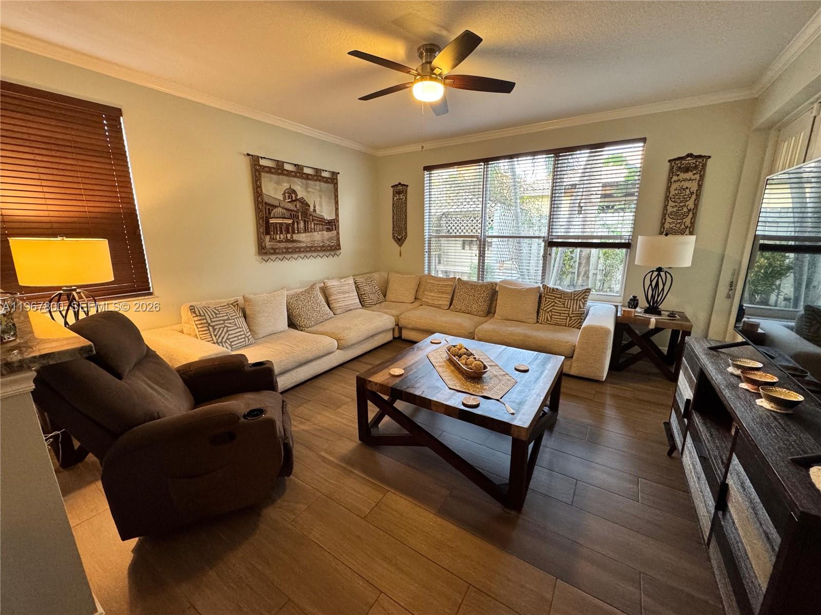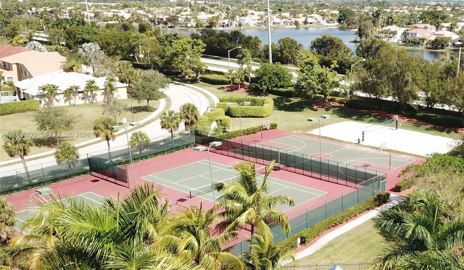 Stunning 2-story home in the desirable Encantada community, offering 4 bedrooms, 2.5 bathrooms, and 2,436 sq ft of living space. Move-in ready with accordion hurricane shutters installed in 2024 and garage epoxy added in 2025. The first floor features an updated kitchen with stainless steel appliances, renovated half bath, new flooring throughout, new A/C, office/bedroom, and laundry room. Enjoy 2-car garage, stamped driveway, and a brick-paved backyard with BBQ, bar, and exterior awning. Upstairs offers 4 bedrooms and 2 full baths, including a spacious master with Jacuzzi tub and glass-enclosed shower. Community amenities include pool, clubhouse, tennis and volleyball courts, and 24-hour guarded gate. Conveniently located short distance to public schools and charter options.