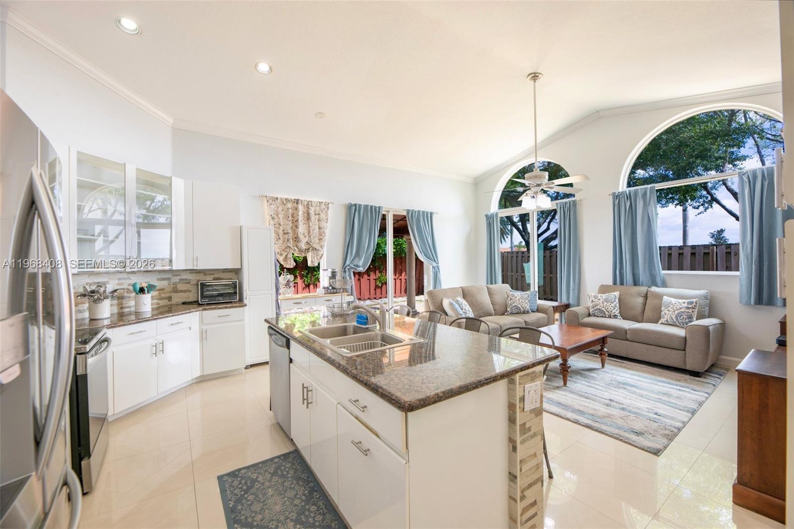 Highly sought after one story 3 beds and 2 baths floor plan in Doral. Great value on a home that has a NEW ROOF installed in June 2020 and NEW HURRICANE IMPACT WINDOWS AND DOORS in 2025. Spacious modern and open floor plan home with vaulted ceilings and lots of natural light. Enter into the home's formal foyer that leads to the formal living room and formal dining room. Bright open kitchen with ample counter space and lots of cabinets together with a breakfast area and family room that overlooks the covered patio and backyard. Main bedroom with double door entry, tray ceilings and double walk-in closets. Main bathroom has dual vanities, separate shower, roman tub and enclosed toilet and bidet room. Separate laundry room features cabinets for storage and a utility sink for convenience. Two car garage with double doors and plenty of storage space. Automatic garage door openers for both doors. Double extended driveway is spacious. Partially covered back patio and plenty of trees and fence in the back for privacy. Backup generator installed in the home and recently serviced. Costa Verde is centrally located near major highways, shopping and dining. Community features a 24 hour security gate, community pool and resort style area and playground. Low association fee which includes cable and front lawn maintenance.