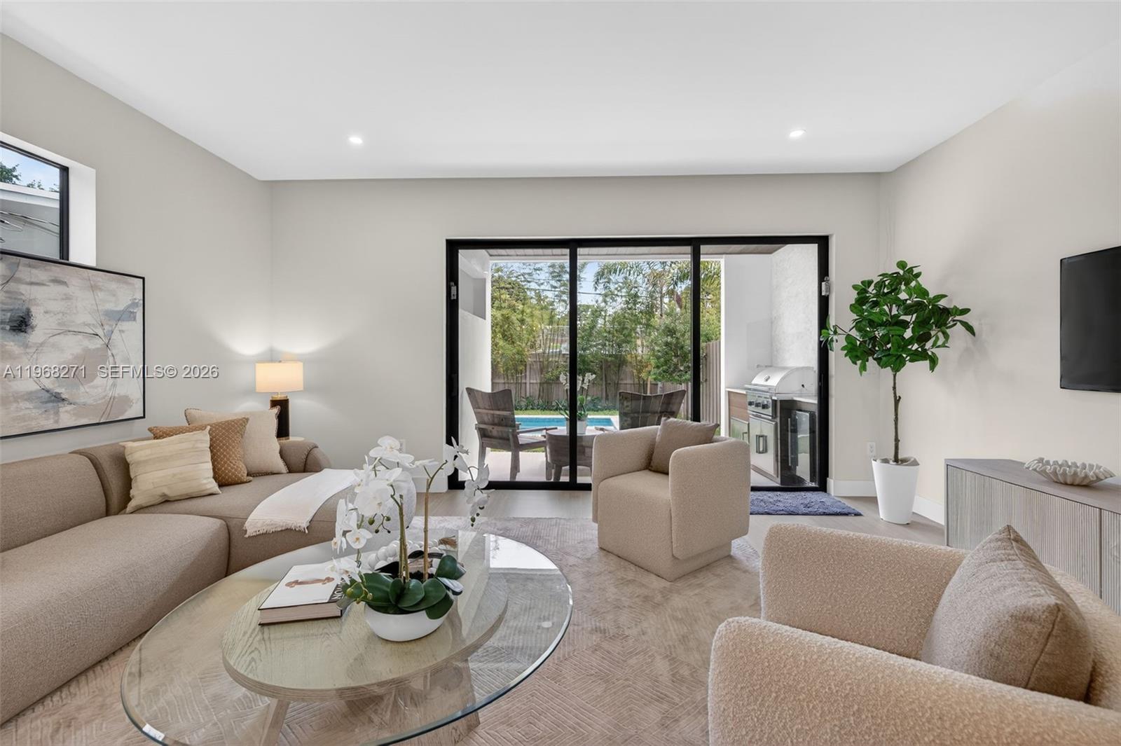 SOLID CONCRETE 2026 CONSTRUCTION — including the second floor and roof — located in a non-flood zone on one of the quietest streets in the neighborhood with No HOA. This exceptional 2-story home blends structural strength with ultra high-end designer finishes in a prime walkable location near shopping and dining, and zoned for 5-star rated Harbordale Elementary School. Spacious bedrooms feature en-suite baths and walk-in finished closets throughout with custom built-ins. The primary suite offers dual finished closets and a spa-inspired bath with soaking tub and oversized shower. Architectural highlights include glass railings and 8-foot doors throughout, creating an open, elevated feel. The chef’s kitchen is equipped with a Thermador Professional appliance package, gas range, built-in refrigerator, imported stone countertops, and floor-to-ceiling cabinetry. An indoor bar with dedicated wine and beverage centers enhances entertaining. Enjoy a private backyard oasis with a saltwater, glass-tiled heated pool, expansive yard with alley access, and outdoor summer kitchen with grill, sink, and icemaker. Smart home features include Sonos audio, internet access points upstairs and down, and front and rear security cameras with DVR, and an EV-ready garage for convenient at-home charging. Expansive driveway with room for 4 vehicles, private alley access, and superior craftsmanship throughout. Luxury, privacy, durability, and walkability — all in one extraordinary residence.
