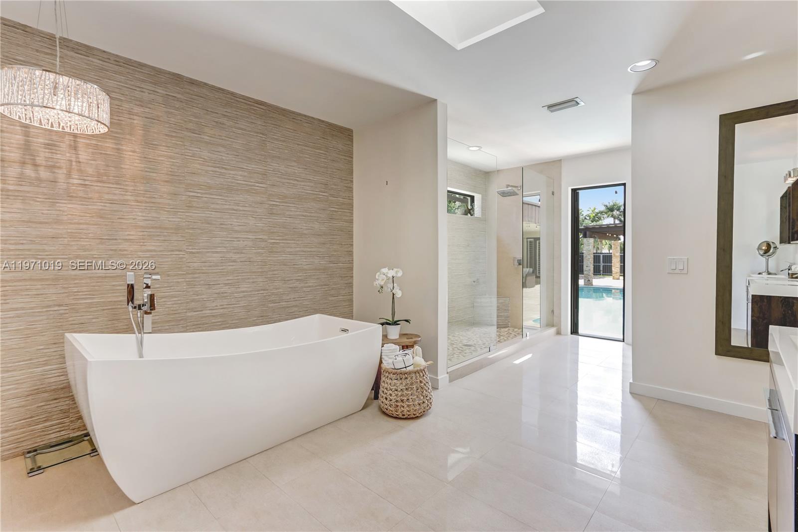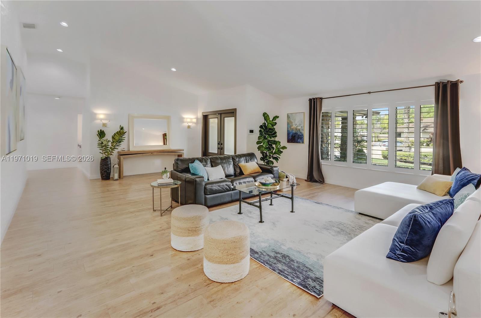 Buyers will love this extraordinary 5 bedroom home designed with beautiful finishes, soaring ceilings, complete impact glass, and gorgeous flooring throughout. The flowing layout offers amazing indoor-outdoor connectivity with all rooms leading to outdoor living. Amazing kitchen is flooded with natural light and boasts an oversized island, plentiful storage, deep stainless farm sink, sleek appliances. The kitchen hub conveniently flows into the immense family room highlighted by a vaulted beamed ceiling. The primary retreat is grand in size with a enviable walk in closet and spacious spa bath with patio access. The outdoors is an entertainer’s dream consisting of an extra-large covered patio with fully-equipped summer kitchen accented by exquisite granite and stone, an oversized heated pool, and a unique fireplace area for cozy evenings. This home will exceed your expectations!