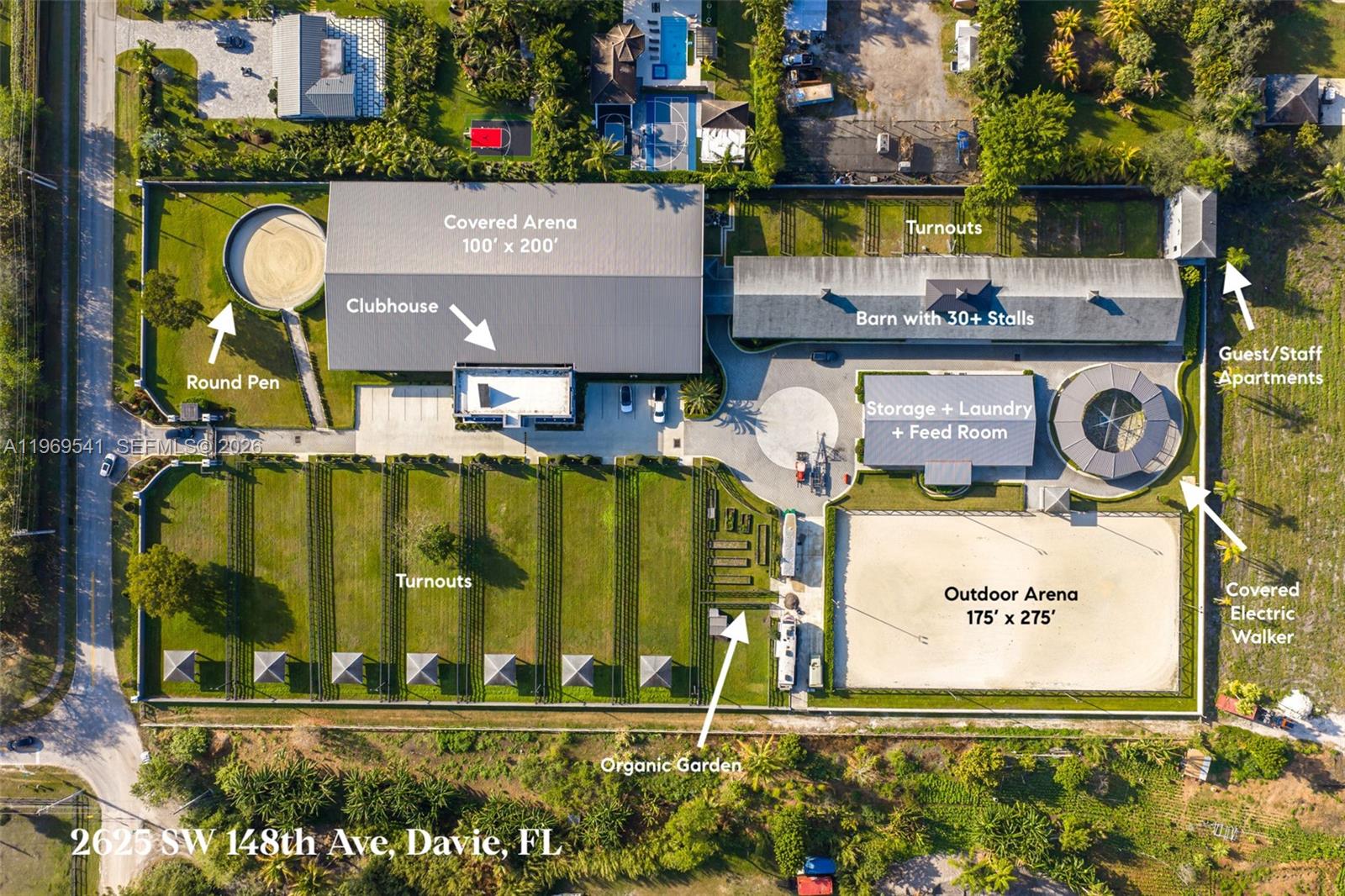 When only the best will do! This is not just an equestrian property — it’s a world-class show barn designed for riders operating at the highest level of the sport. The 5-acre gated facility offers longevity & elite performance just 40 minutes from Miami, 1 hour from Wellington & 30 minutes from Fort Lauderdale Beach. The concrete barns feature 38 Rower & Rub stalls with premier footing, Nelson automatic watering systems, 24-hour surveillance & 10 run-outs. There are 7 oversized, irrigated grass paddocks with permanent concrete run-in sheds & fans for year-round comfort. Broward County’s largest covered indoor arena (100' × 200') is complemented by a sprawling (175' × 275') outdoor arena, along with professional dressage mirrors, a hot walker, treadmill & dry treadmill. All stalls connect to a full underground drainage system designed to eliminate flooding. A 3-story luxury clubhouse overlooks the arena and includes indoor/outdoor viewing areas, management offices, a bar, feed room, laundry room & a beautifully appointed tack room. Above is a 2-bedroom, 2-bath apartment ideal for a trainer or owner, plus a separate 3-bedroom staff apartment & full grooming facilities. Direct trail access connects to Vista View Park and the Florida Trail network, and the property is conveniently located near American Heritage School. New Price!