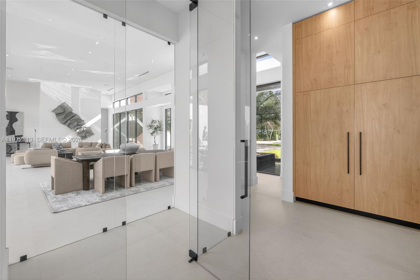 Completed in December 2025, this modern luxury residence sits on an expansive 34,000 SF corner lot, offering exceptional privacy and a quiet setting. The single-story home spans 6,658 SF and features 12-foot ceilings throughout, with a dramatic 16-foot ceiling in the main living area. The home offers 5 bedrooms, each with its own walk-in closet, and 6 full bathrooms. Designed for both everyday comfort and entertaining, the chef’s kitchen is equipped with Wolf and Sub-Zero appliances, a hidden walk-in pantry, and a stunning glass-enclosed wine cellar. Oversized 48” x 48” porcelain flooring flows throughout the home, complemented by porcelain finishes in all bathrooms. Additional features include a 3-car garage with 12-foot ceilings and the potential for car lifts, a concrete roof, speaker and camera system throughout and top-tier impact windows, providing durability, energy efficiency, and peace of mind.