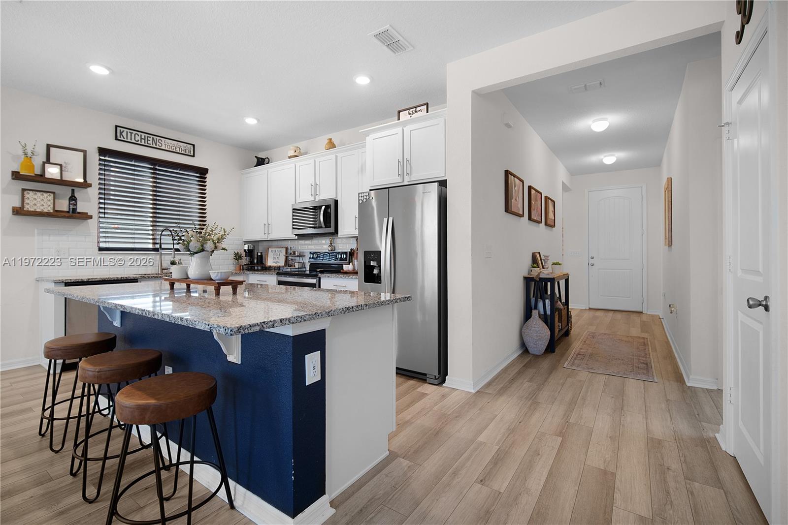 Welcome to this 2021-built home where thoughtful upgrades and effortless living come together! From the moment you enter, vaulted ceilings and natural light create an airy, inviting atmosphere. The modern open kitchen, finished with granite countertops, flows seamlessly into the main living area, perfect for entertaining, gathering, or relaxing at the end of the day. Two bedrooms are positioned near the front of the home, while the primary suite is privately situated toward the back and features a brand-new shower, dual sinks, and a walk-in closet. Both bathrooms were updated with granite countertops. Engineered laminate flooring extends throughout the home, with carpeted bedrooms for added comfort. The layout also offers a spacious laundry room, generous closet space throughout the home, and a 2-car garage. Outside, the backyard offers a blank canvas with room to design your own outdoor oasis or future pool. Conveniently located near Cherry Lake Park, Lakeridge Winery, and local favorites, this home is move-in ready and waiting for its next chapter!