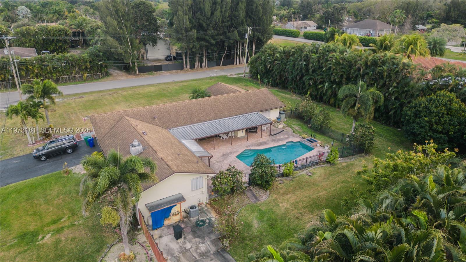 Corner lot estate on over 35,000 SF in desirable Southwest Ranches. This 5-bedroom, 3-bath home offers approximately 4,000 SF of living area (as per owner) and plenty of room to expand, customize, or create your dream outdoor retreat. Enjoy a private pool, lush fruit trees, and expansive yard space with endless possibilities. Perfect for buyers seeking privacy, space for toys, RVs, boats, or future additions. Rare large-lot opportunity in a prime location.