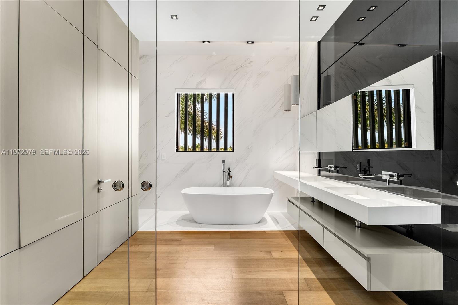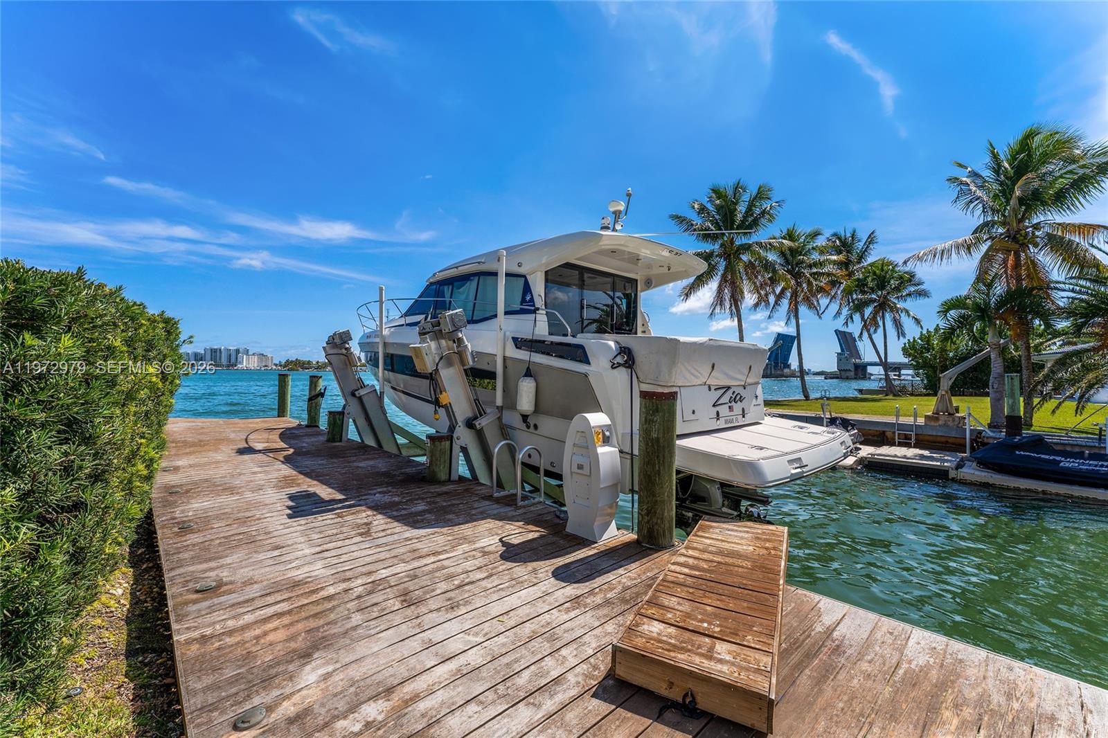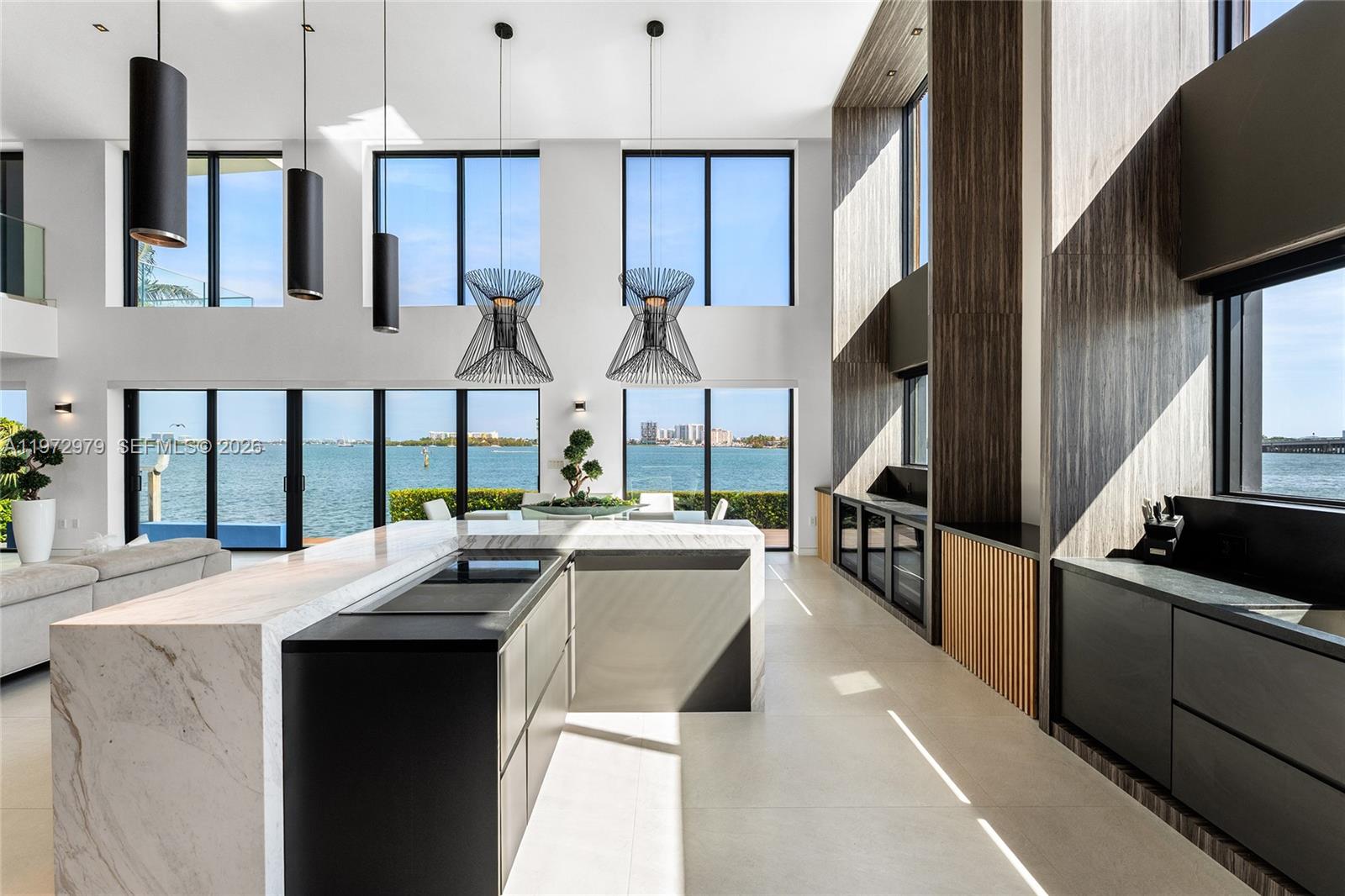 Tri-level modern bayfront estate in a quiet cul-de-sac sits on a coveted 9,650 SF point lot offering 171’ WF, 60 FT dock w/boat lift, direct bay & ocean access. Gated entry, 5BR/5.5BA incl. staff BR, 5,326 SF & dramatic Great Room w/spacious open floor plan seamlessly integrates living, entertaining, & dining areas all w/water views. Features soaring 24+ ft ceilings & enveloped by walls of glass opening to an expansive deck w/infinity pool overlooking the bay. Chef’s kitchen w/top-tier Miele appliances, integrated cabinetry & wine chillers. The 2nd floor luxe primary suite boasts a bayside terrace & stunning spa-inspired bath. Third-level rooftop lounge made to entertain with sweeping open bay & sunset views. Prime location minutes to beaches, Bal Harbour, Miami Beach, downtown & MIA.