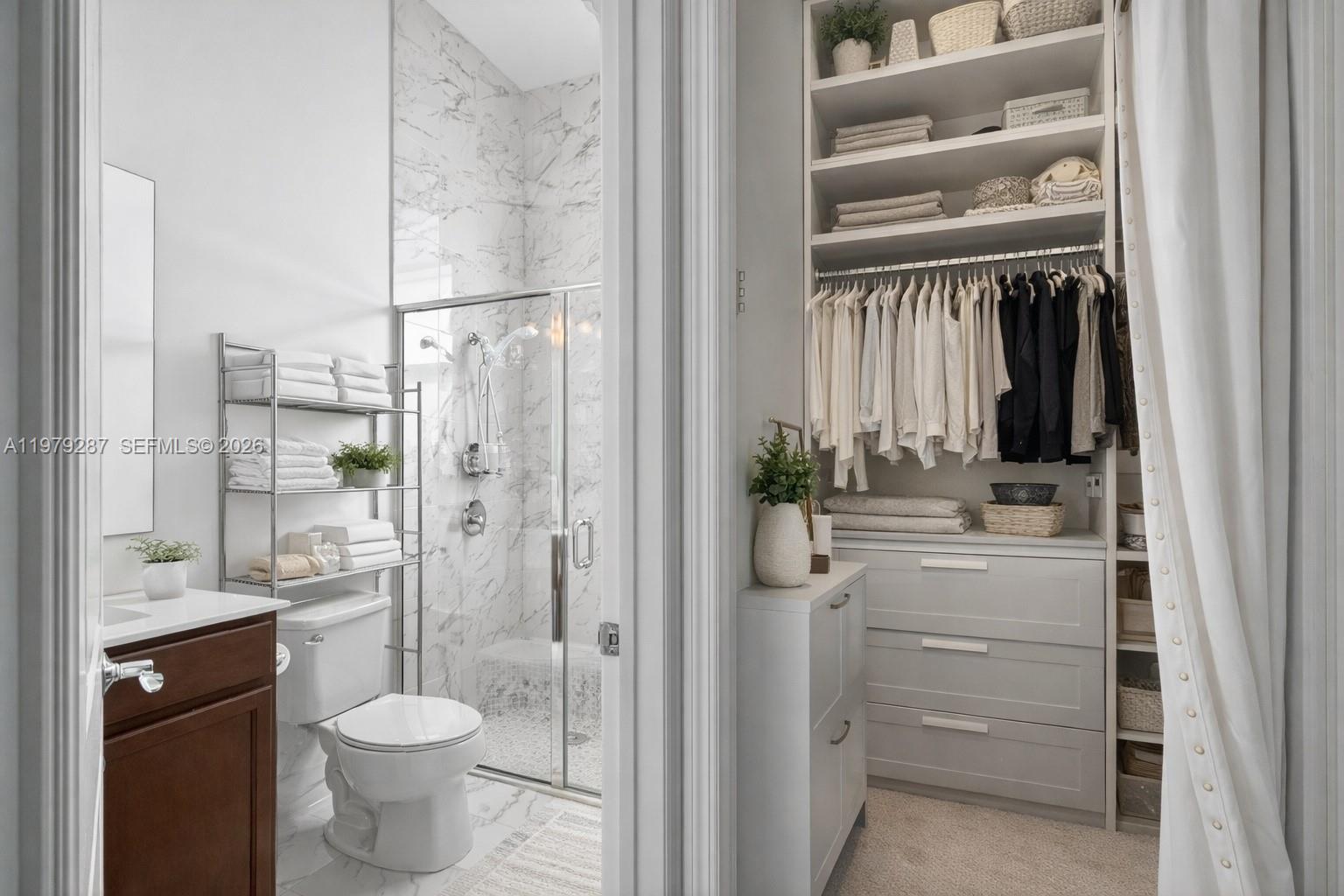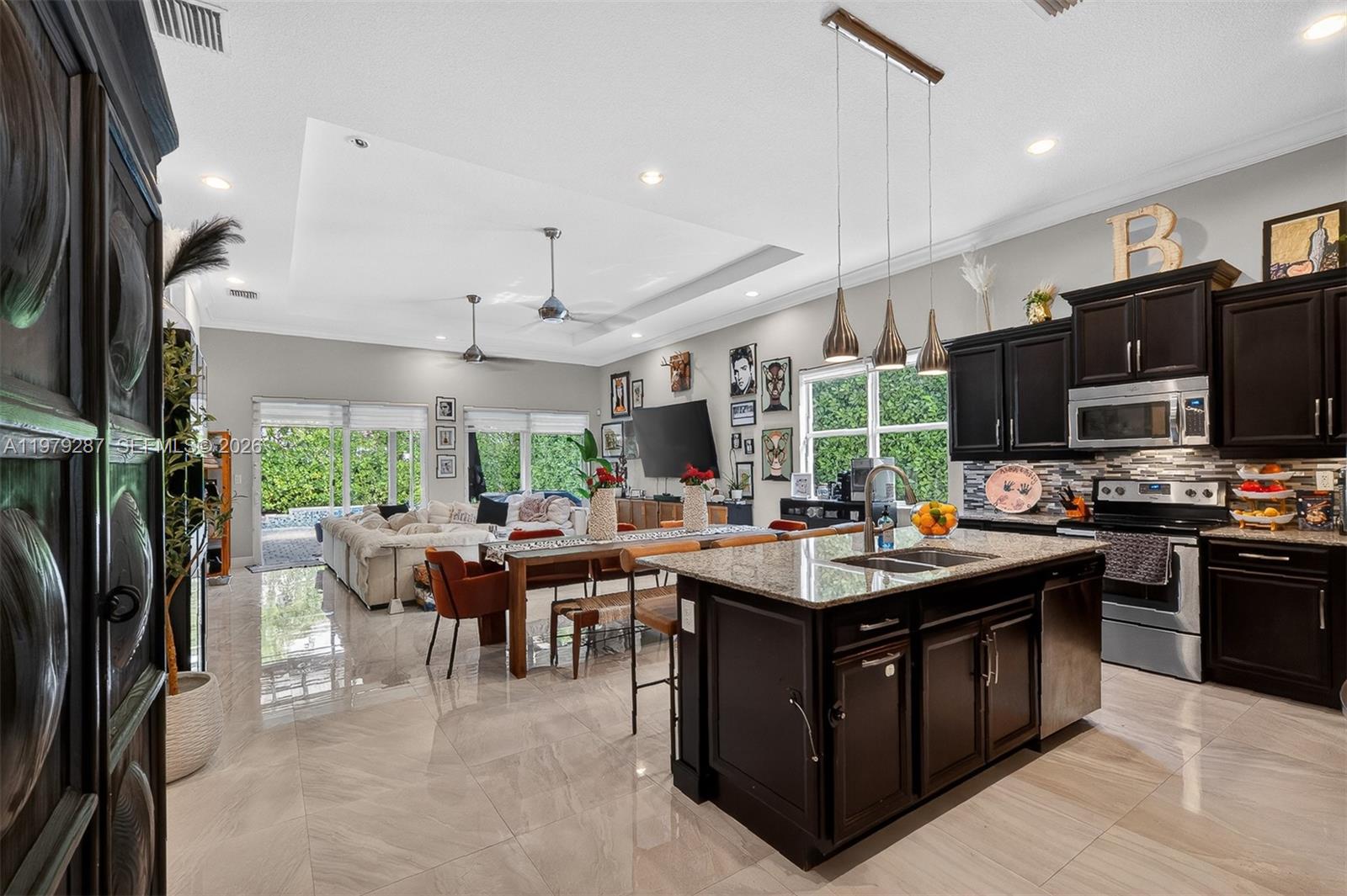 Impeccably maintained and truly stunning, this exceptional residence features ** SOARING 14-foot ceilings throughout the entire interior, including closets **creating a grand and airy atmosphere rarely found in today’s homes. The beautiful open floor plan is perfect for both everyday living and entertaining, complemented by a stylish wet bar that elevates the main living space. Thoughtfully designed with 8-foot doors, impact windows, and California Closets throughout, every detail reflects quality and elegance. Each bedroom features its own private bathroom, offering comfort and privacy for family and guests. Step outside to your private backyard retreat featuring a sparkling pool and beautiful pergola, perfect for relaxing or hosting gatherings. The home is situated on an oversized 7,200+ SqFt builder’s lot with ample room for an RV or boat along the side. Photos simply do not capture the true beauty and scale of this home, must see to appreciate.