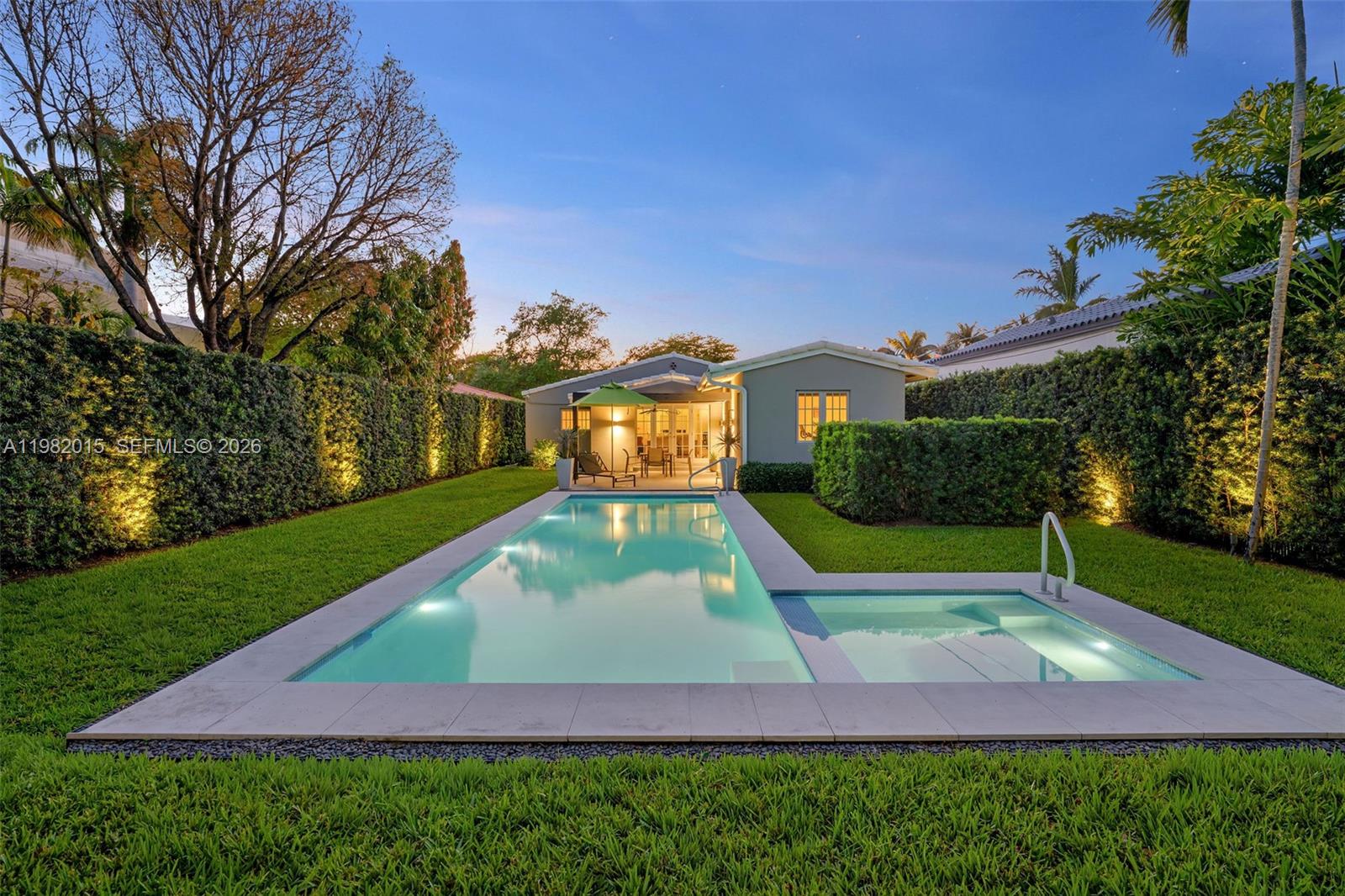 South Beach Deco Stunner! Renovated & ready residence set on an 8,000 Sq.Ft. lot. Minutes from the world-renowned Lincoln Road Mall, Convention Center, Miami Beach Botanical Garden, Sunset Harbour, New World Symphony, & Miami City Ballet. This home offers the perfect blend of tranquility & proximity to Miami Beach’s best dining, shopping, & entertainment, all in the coveted Palm View Neighborhood. Inside find soaring ceilings (almost 17' in great room) real wood French oak floors, & beautiful crown molding that highlight the home’s chic Art Deco character. The thoughtfully updated eat-in kitchen features Bosch appliances, blending modern convenience with timeless style. Boasting Sonos throughout, a custom marble desk with built-in shelving, & period skylight updated with impact glass. Enjoy a thoughtfully designed split floor-plan, where the spacious primary suite occupies a private rear wing of the home, roomy dual closets & direct access to the backyard. Outdoors, the fully gated & walled yard has a heated saltwater lap pool & jacuzzi, framed by a 10' hedge & lush landscaping for total privacy. A pergola & patio create an inviting space for outdoor entertaining. This easy-living one-story offers a separate laundry room with sink, a garage with impact door & epoxy floor finishes, with direct access from the garage to the kitchen, & a gorgeous fireplace. Your chance to enjoy an exceptional Miami Beach Lifestyle. This home is everything you're looking for, no headaches here!