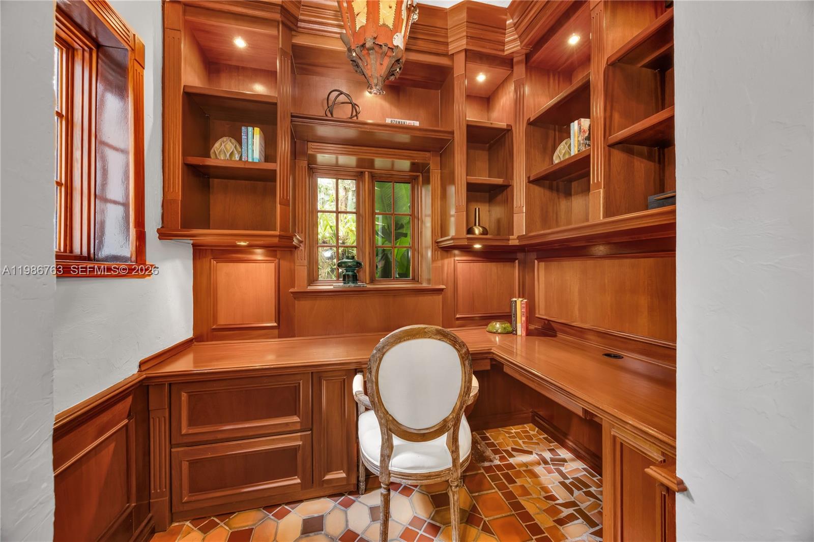 Located in the prestigious heart of South Coconut Grove, this extraordinary 2,733 square foot, 4 bedroom, 3 bathroom home exudes 1930’s charm, but with updates fit for the modern buyer! The double-door entrance leads to a stately foyer with coral rock floors opening to the spacious eat-in kitchen with center island, new stove, and stainless steel appliances. To the opposite side of the foyer sits the fabulous living room with vaulted wood-beamed ceilings with skylights, stunning fireplace, and cozy office nook with built-ins. The split floorplan includes 2 bedrooms as well as the stunning primary suite with sitting room, walk-in closet, elegant bathroom, and pool views to one side, while an additional bedroom/bathroom is privately located on the other side of the home. The 8,064 square foot corner lot is landscaped with native plants, oolite stone borders, gracious outdoor living areas, and a stunning tropical pool. Other special features include impact glass throughout, generator, beautiful vintage tile, stone, and wood flooring, and so much more in Miami’s most desired neighborhood.