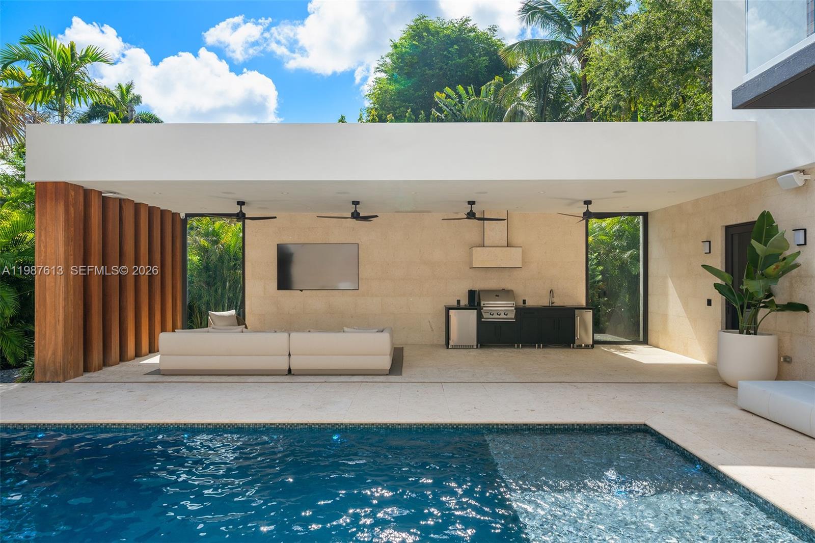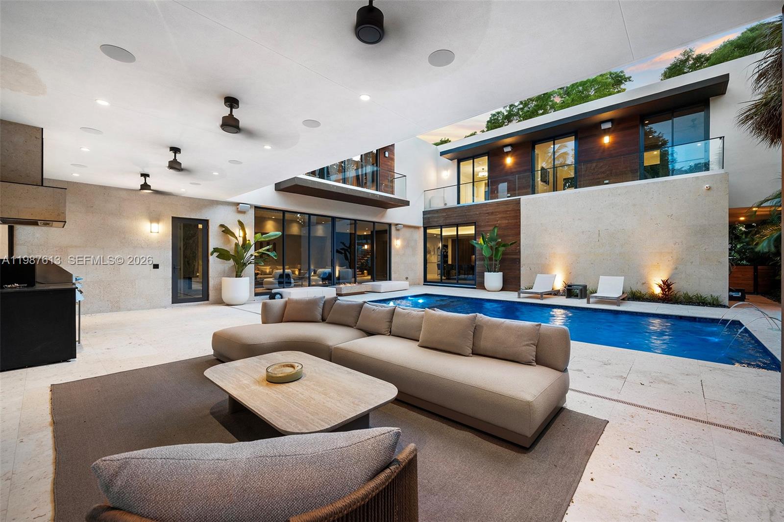 This luxurious 5-bedroom, 6-bath Florida Modern residence boasts over 5,500 square feet of elegantly designed indoor and outdoor living space, nestled among lush tropical landscaping for ultimate privacy and tranquility. Floor-to-ceiling windows bathe the interiors in natural light, highlighting an open-concept layout that effortlessly blends indoor sophistication with outdoor serenity—ideal for entertaining. A dramatic dining area with soaring 22-foot ceilings and a striking floating staircase sets the tone for the home’s impressive design. The impeccably curated Armazem kitchen—with a custom wine cellar—flows into a spacious great room that opens to a covered poolside terrace featuring a fully equipped outdoor kitchen with an icemaker.