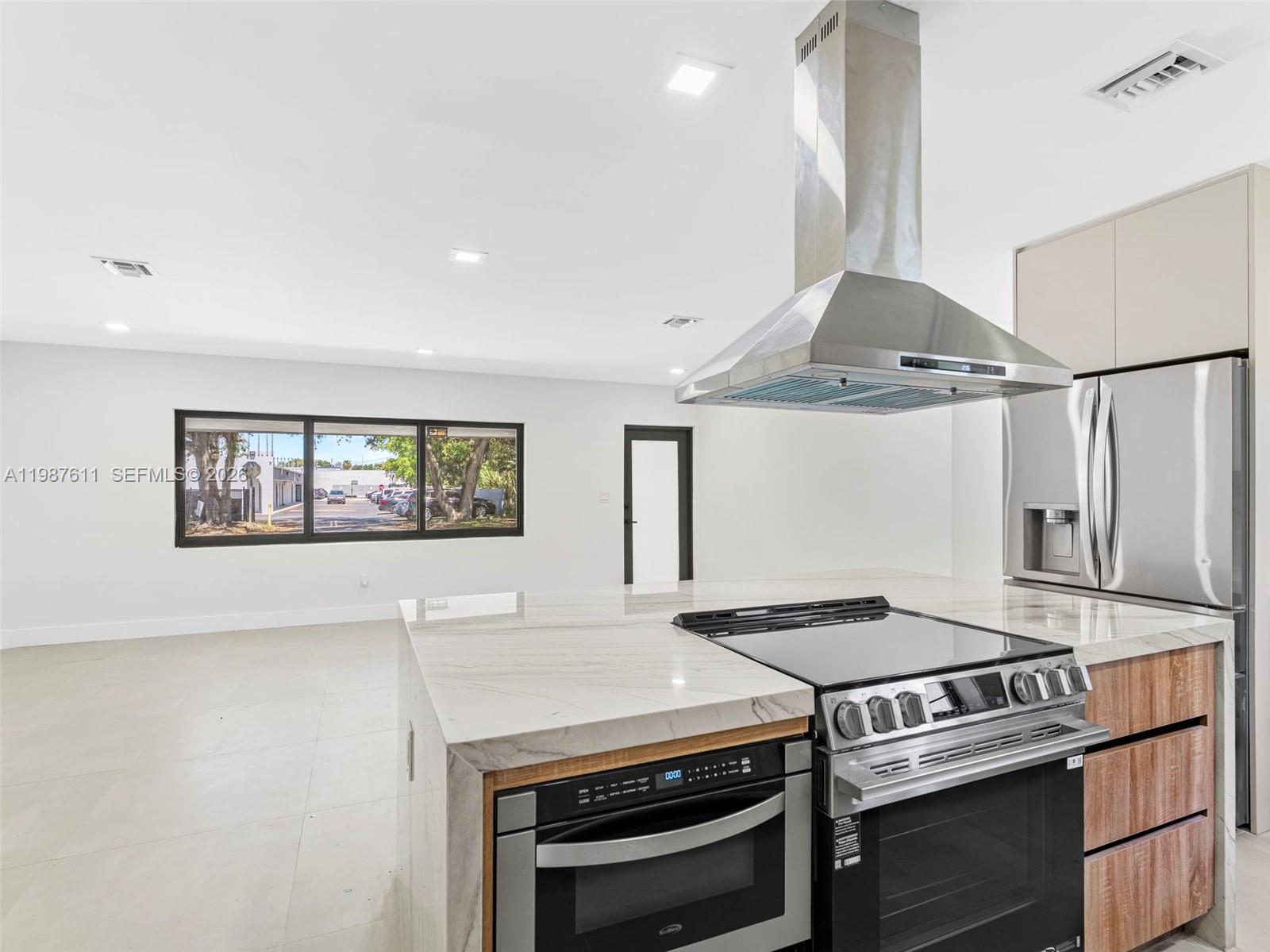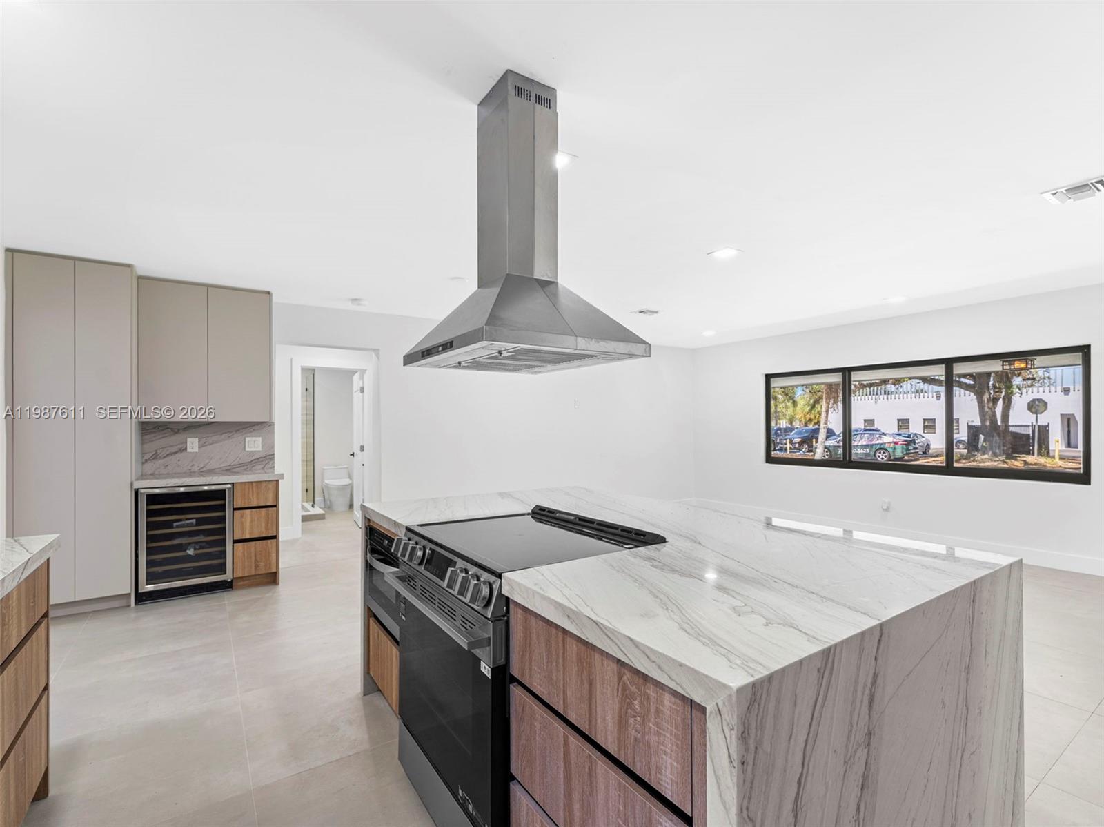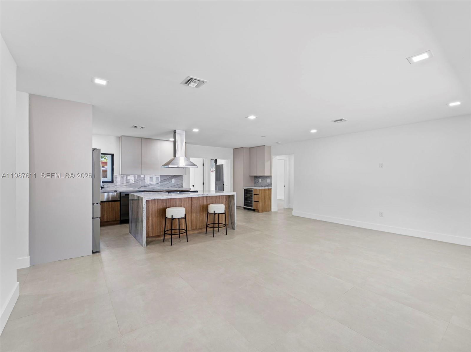 Immaculate almost-new construction offering 7 bedrooms and 4 bathrooms with high-end finishes throughout. This fully remodeled home features a new flat tile roof, impact windows and doors, and is fully fenced for privacy. Interior highlights include large porcelain tile flooring and a stunning designer Italian kitchen with quartzite countertops and cooking island, smart stainless steel appliances, microwave drawer, wine cooler, and bar/coffee station. Custom European cabinetry is featured in closets, while the bathrooms showcase porcelain tile, modern shower glass panels, smart toilets, and LED mirrors for a sleek spa-like feel. The home also includes a separate laundry room, new AC system, and tankless water heater. A private in-law suite or potential rental unit offers 2 bedrooms, 1 bathroom, kitchenette, and separate entrance. In addition, the right wing of the home could be rented out for additional income stream. The expansive backyard has room for a pool or jacuzzi and includes a concrete slab ready for a pergola or outdoor entertaining area. Custom driveway with decorative rock design and ample parking. Fit for an investor looking to make at least 3 different rental incomes, 14+ AIRBNB home or multi-generational family looking to live under 1 roof and split expenses. Centrally located in the heart of Miami, minutes from Sunny Isles beach and major highways. No HOA. Schedule to see it now while it last.