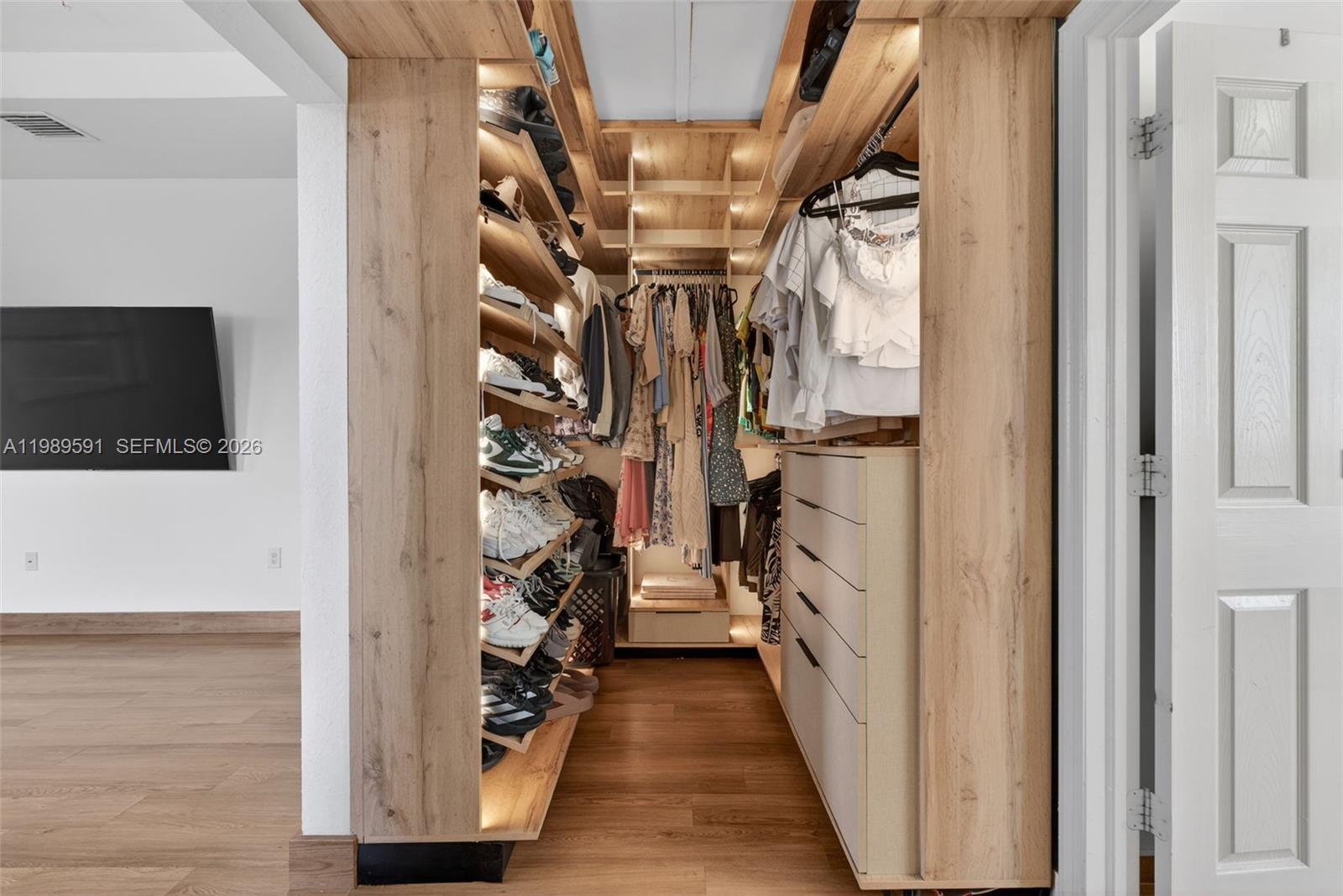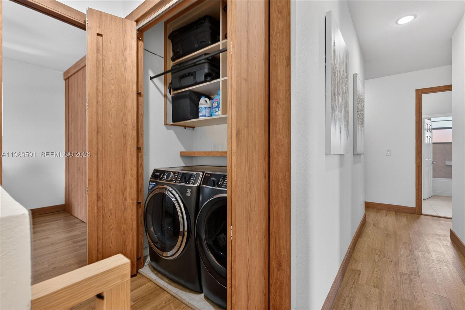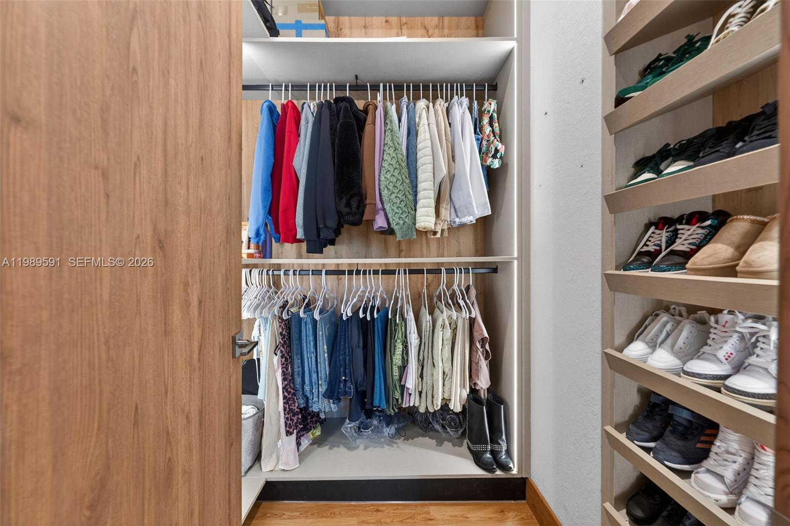 Absolutely stunning two-story single-family home featuring 6 bedrooms and 3.5 bathrooms, designed with both luxury and functionality in mind. The first floor showcases elegant porcelain tile flooring, while the stairs and second level feature sleek, modern vinyl flooring for a clean and contemporary look. The chef’s kitchen is beautifully finished with rich wood cabinetry, quartz countertops, and stainless steel appliances—perfect for both everyday living and entertaining. Upstairs, you’ll find a conveniently located laundry room and spacious, well-designed living areas. A standout feature of this home is the high-end custom-built closets throughout, offering premium storage solutions with a luxury finish—ideal for organization and maximizing space in every bedroom. Complementing this, the home features upgraded, designer interior doors, adding a sophisticated and upscale touch rarely found at this level. Smart home upgrades include Yale keyless entry locks and a Nest smart thermostat for comfort, efficiency, and security. Step outside to your private backyard oasis, complete with a resort-style swimming pool featuring a beach entry and saltwater chlorination system (built in 2016). The backyard is fully finished with a travertine deck and surrounded by lush podocarpus hedges, providing exceptional privacy and a true South Florida outdoor living experience.