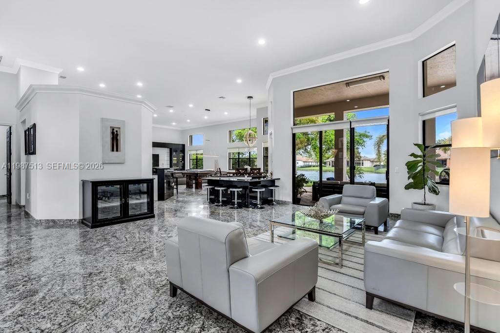 Stunning lakefront home located in the exclusive guard-gated community of Riverstone in West Davie. This spacious residence features six bedrooms and five full bathrooms, including three en-suite bedrooms. Grand living space with volume ceilings and a formal dining room, creating an open and impressive layout. Designed for entertaining, the home features a step-down wet bar with beverage cooler, over 4,200 square feet of custom granite flooring, and 8-foot high interior and exterior doors throughout. The primary suite includes dual vanities, a soaking tub, and an oversized custom marble walk-through shower. The home is equipped with a tankless water heater, three central AC units, and hurricane-impact doors, providing full hurricane protection. Designed for entertaining both inside and out, the outdoor space features a summer kitchen, tropical landscaping, and a resort-style pool area. The patio is fully enclosed with hurricane shutters, and a cabana bath provides direct access to the pool. The pool was remodeled in 2020 and includes a saltwater system, new heater and pumps, and full automation controlled via app. Tall privacy hedges surround the large one-plus-acre corner lot. Community amenities include a guard-gated entry, pickleball courts, basketball courts, pavilion, and playground. Riverstone is conveniently located near Vista View Park, highways, shopping, dining, airport, and hospital. Move-in ready and meticulously maintained.