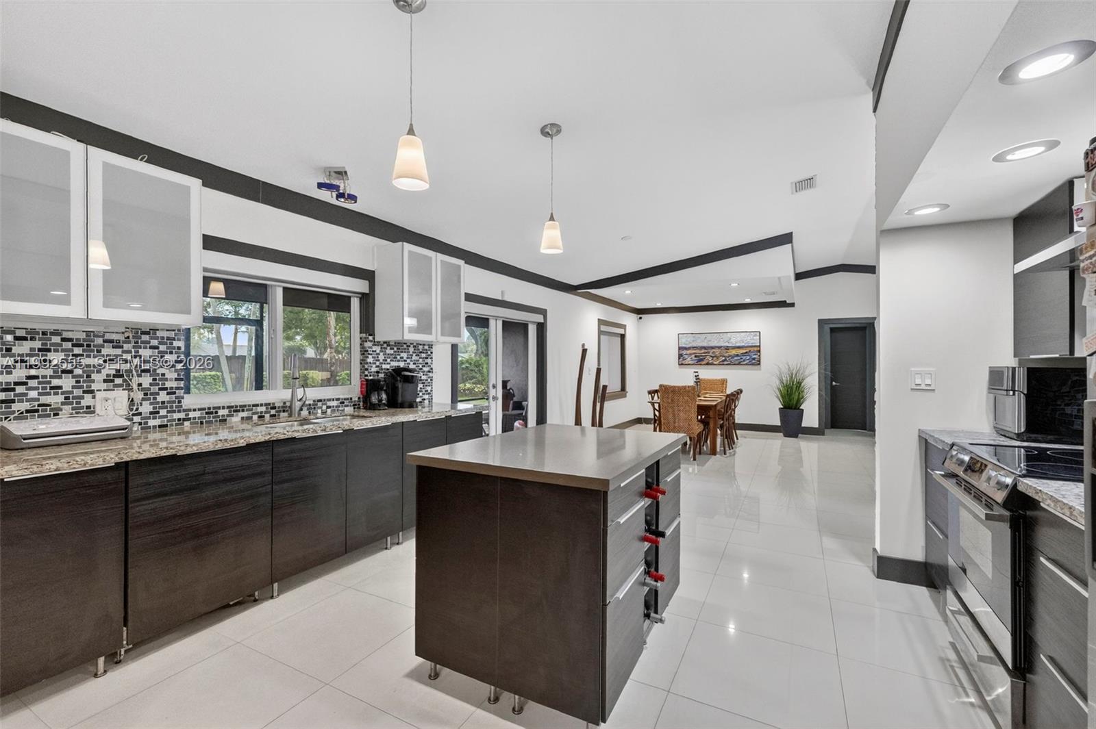 Exquisite Modern Ranch in Fort Lauderdale | No HOA Discover unparalleled luxury and design in this meticulously maintained, 1,781 sq. ft. ranch-style sanctuary. Located at 6800 NW 24th Terrace, this 3-bedroom, 3-full bath masterpiece offers a sophisticated open-concept floor plan characterized by high-end finishes and an "absolute must-see" aesthetic. The Great Room & Interior From the moment you step onto the porcelain flooring that flows seamlessly throughout the entire home, the attention to detail is evident. The main living area boasts: Architectural Elegance: Vaulted ceilings accented by custom trim, baseboards, and a stunning Natural Stone accent wall. Designer Lighting: A custom chandelier and recessed lighting throughout create an inviting, high-end ambiance. Seamless Design: High-quality window treatments and an open flow perfect for modern living. A Chef’s Dream Kitchen The enormous chef-style kitchen is the heart of the home, featuring: Premium Finishes: Custom cabinetry, floating island, and gleaming glass tile backsplashes. Top-Tier Appliances: Stainless steel suite, including a professional hood, side-by-side refrigerator with filtration, and double sink with custom fixtures. Unique Touches: A charming breakfast nook with wood-panel wall accents provides a warm, finished look to the sleek design.