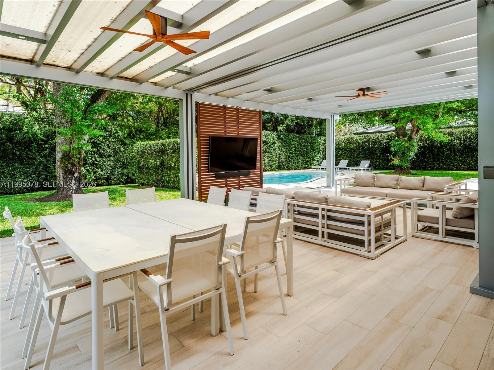 Completely rebuilt in 2017 (construction permits available), this exceptional residence provides 3374 SF of indoor & covered outdoor areas. Every major system and finish has been thoughtfully upgraded, creating a turnkey home designed for both comfort and style. The renovation included electrical systems (buried utility lines), updated plumbing (removed cast iron pipes). Interior and exterior improvements include reconfigured hurricane resistant windows and doors, framing & drywall, interior doors, bathrooms, flooring. The kitchen and baths showcase modern cabinetry, countertops, and appliances. A metal roof with gutters throughout, while mechanical systems were upgraded to include two-zone air conditioning, ducts, and tankless water heaters for optimal efficiency and comfort. Designed with outdoor living in mind, the property features a resort-style heated and cooled pool, along with a custom pergola complete with ceiling fans and a built-in sound system—perfect for entertaining year-round. The lush landscaping includes a fully irrigated yard with three sprinkler zones, a dedicated children’s play area, and a mature podocarpus hedge providing privacy and greenery. Five mature trees, including three stately oaks, further enhance the property’s natural beauty and shade. This is a rare opportunity to own a home, on a 15,600 SF lot, that offers the character of a classic build with the systems, finishes, and lifestyle of a much newer residence.