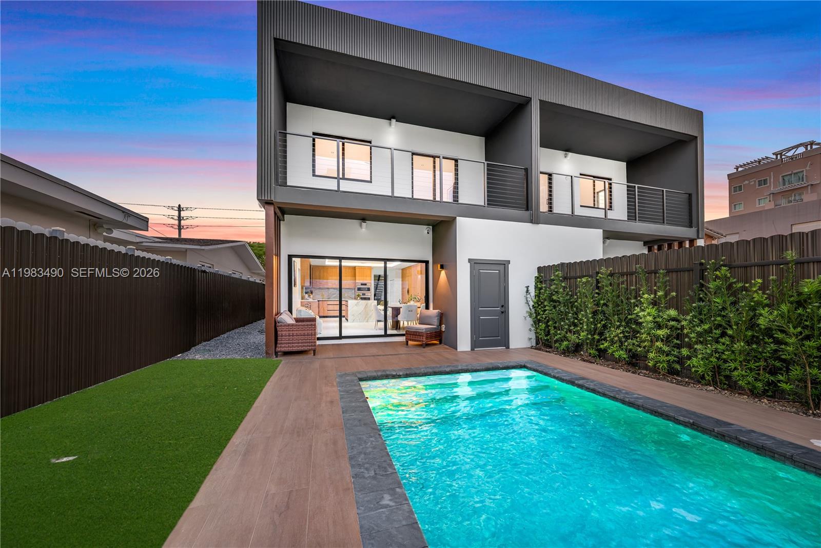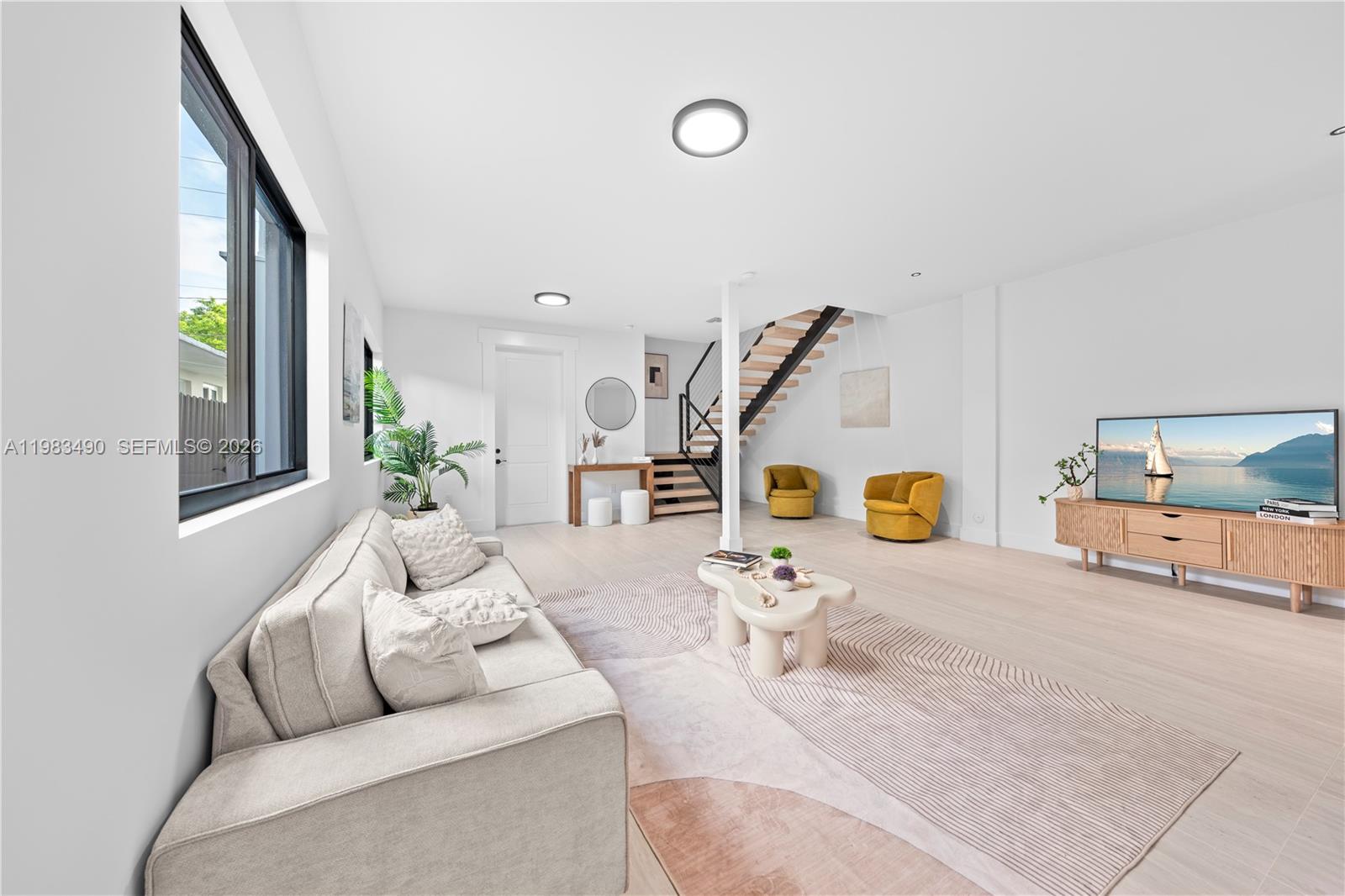 New construction townhome showcasing exceptional craftsmanship and premium finishes throughout. Featuring Serene townhouse 4 bedrooms and 4.5 bathrooms, including a cabana bath, with 2,750 SF under A/C. The open-concept layout is anchored by a designer kitchen with quartzite Bianco Superiore countertops, Porcelana Calacatta Borghini surfaces, custom white oak and hardwood cabinetry, and Bosch appliances. Italian Venice Blanco porcelain flooring flows throughout, complemented by Spanish larch wood accent walls that add warmth and texture. Built-in closets in all bedrooms. Spa-inspired bathrooms include Hansgrohe and Symmons fixtures, LED mirrors, rain shower heads, Kohler toilets, and Sitka soaking tubs for a refined, relaxing feel. Smart home features include Ring-integrated CCTV, outdoor audio, an irrigation system, and pre-wiring for full automation. The outdoor space is designed for entertaining, complete with a saltwater heated pool, WiFi-controlled spa jets, a Coyote summer kitchen, and a Spanish porcelain Augusta pool deck. Additional highlights include Masonite fiberglass entry doors, soft-closing garage doors, and an extensive drainage system for added peace of mind. Ideally located near Brickell, Coconut Grove, and Coral Gables with convenient access to top dining, shopping, parks, and major highways.