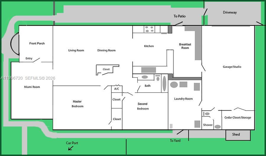 Move-in ready 2,109 sf 2/2 house on two full lots on corner of two side streets, large private yard, 2-car carport w automatic gate, wrought iron fence all around with privacy hedges, locking gates. Lovely landscaping all around with automatic sprinkler system using private well water. Large Miami entry room with huge windows for office or entry foyer. Livingroom, dining room, completely remodeled bathroom with bathtub. Kitchen has original built-in cabinets, rainwater glass inserts, granite countertops. Large breakfast room with side door to outdoor patio area. Large converted garage with power, mini-split A/C, and functioning automatic garage door. Second full bathroom in back. Full laundry/mudroom opening to large private side yard under massive mango tree.