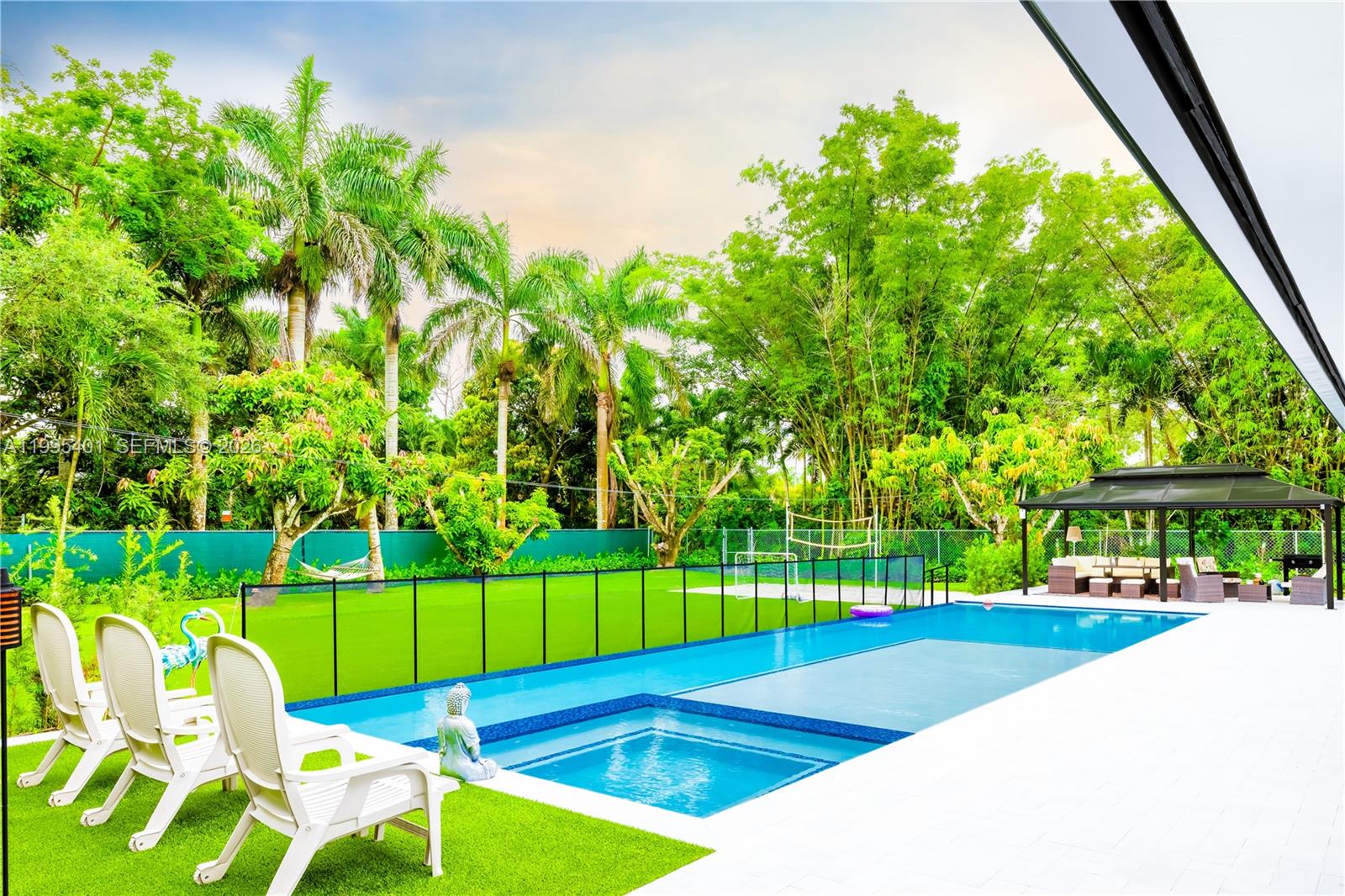 The house features bathrooms and a kitchen that were completely remodeled in 2024. Also added in 2024 was a 50-foot by 18-foot infinity-edge pool, equipped with a heater, a saltwater system, and full automation. The property boasts a synthetic-turf soccer field and a sandy beach volleyball area. The lot spans nearly an acre and is divided by a fence into two sections—each with its own independent entrance—making the undeveloped portion ideal for a business venture or for building a guest house. The driveway features a covered canopy tall enough to shelter a boat or an RV. The home is served by well water and includes a two-car garage. Currently, the property operates as an Airbnb rental; it comes fully furnished and equipped, allowing a new owner to seamlessly continue the business—a process currently managed by a dedicated administrator. The entire operational infrastructure is already in place to ensure the business continues without interruption; we can provide Airbnb financial statements so prospective buyers can review the revenue figures. The roof and air conditioning system were already installed when we purchased the property in 2021, though they were relatively new at the time. This residence offers spacious interior and exterior living areas, featuring beautiful garden spaces with tremendous potential for a wide variety of uses.