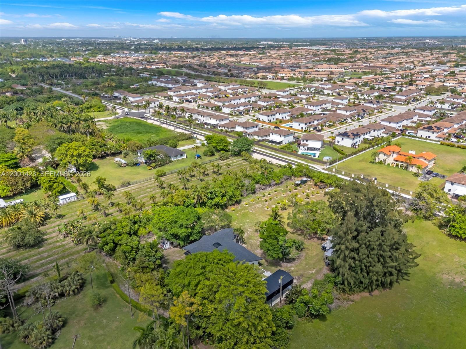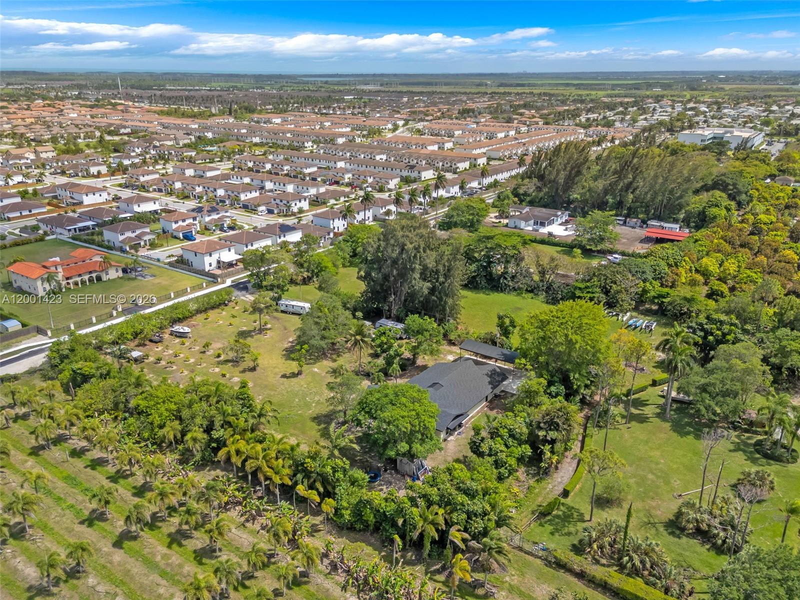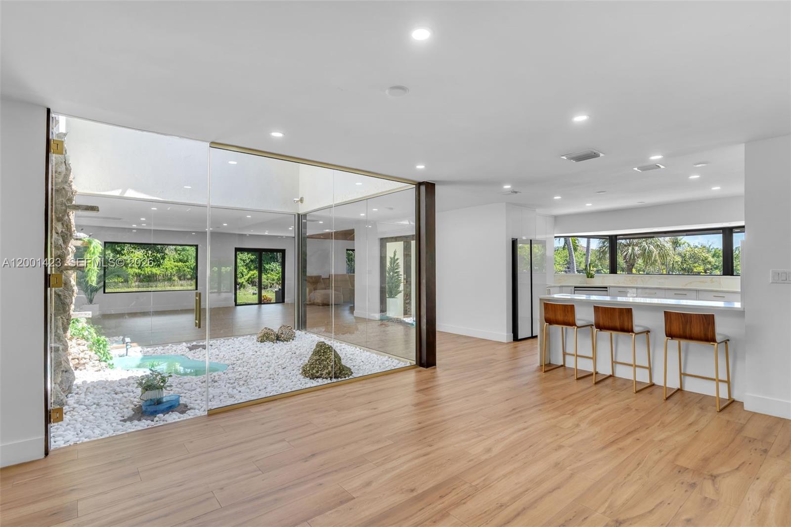 This beautifully remodeled 4 bedroom, 2 bathroom residence offers a rare blend of architectural character, modern upgrades, and expansive outdoor living. From the moment you arrive, the property sets a distingueshed tone with its clean, modern lines. Inside, a bright open layout is enhanced by elegant Italian tile flooring and incredible natural light. The main living area features soaring vaulted wood ceilings and dramatic floor to ceiling windows, creating a warm yet sophisticated space ideal for both everyday living and entertaining. At the heart of the home, a stunning glass enclosed interior garden courtyard creates a true architectural statement, bringing natural elements indoors and serving as a tranquil focal point that seamlessly connects multiple living spaces. The chef’s kitchen showcases sleek cabinetry, stainless steel appliances, and quartz countertops with a waterfall edge island. Completely renovated in 2024, no expense spared in this meticulous renovation, showcasing top of the line materials, the home includes new plumbing, electrical, roof, A/C, & so much more, along with commercial grade impact windows and doors. The property offers over 50 fruit trees, expansive grounds with room to create your own ideal outdoor setting, like a pool or outdoor kitchen, the possibilities are unless. A covered boat/RV shelter with electricity. Ideally located just minutes from the Florida Turnpike, shopping and dining options, less than 5 miles from Black Point Marina, offering direct access to Biscayne Bay for boating and waterfront dining.