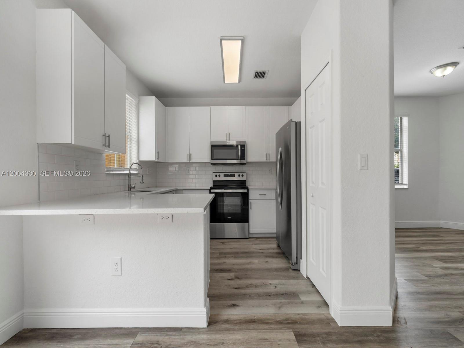 Discover modern comfort and versatility in this stunning two-story corner townhome, ideally situated within a secure gated community. New HVAC. The open-concept interior is bathed in natural light, updated vinyl flooring and a neutral palette that perfectly complements any decor. At the heart of the home, the chef-inspired kitchen is finished with elegant white shaker cabinetry, pristine quartz countertops, and a classic subway tile backsplash, all centered around a full suite of stainless steel appliances. Uniquely designed for modern living, this residence features a rare and highly sought-after first-floor bedroom, offering the perfect setup for a guest suite, home office, or multigenerational living. Large sliding glass doors lead from the main living area to a private, fully fenced-in backyard, providing a secluded oasis for outdoor dining, pets, or relaxation. The lifestyle here is defined by convenience and resort-style amenities. Residents enjoy exclusive access to a sparkling community pool and a fully equipped fitness center. Providing exceptional value, the monthly HOA fees include both high-speed internet and cable, simplifying your utility bills and ensuring you stay connected from day one. This turnkey home offers a perfect blend of style, function, and community perks in an unbeatable location.