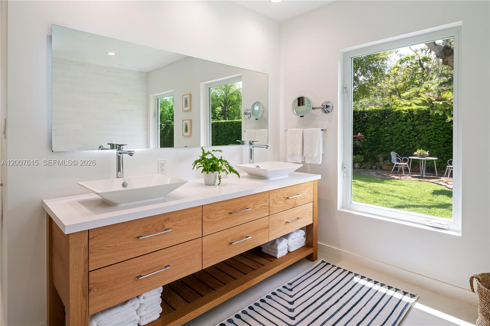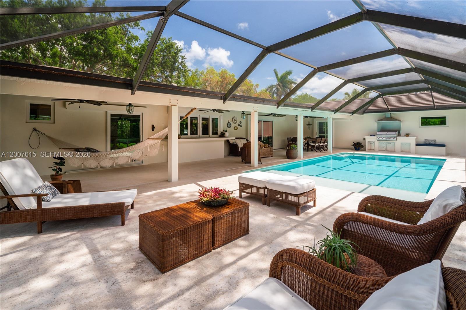 This exceptional 4-bedroom, 2.5-bath home is ideal for comfort, entertaining, and outdoor living. Ideally located near top-rated public and private schools, parks, shops, and bike paths, it is tucked away at the end of a quiet cul-de-sac with minimal road traffic. The spacious primary suite features his-and-hers walk-in closets and an en-suite bath with dual sinks, dual shower heads, and a separate tub. The large kitchen boasts wood cabinetry, granite countertops, and a generous breakfast nook. The open living, dining, and family areas offer easy flow, with disappearing sliding glass doors connecting indoor and outdoor living. Step outside to a covered screened enclosure that helps keep bugs out and enjoy the large patio—perfect for entertaining—with its built-in grill and bar and easy access to the kitchen, plus a sparkling pool for relaxing and fun. The fenced backyard provides added privacy. The home also includes a dedicated laundry room with cabinetry and a utility sink. All windows and doors are impact-resistant, and the home has a concrete tile roof (2019).