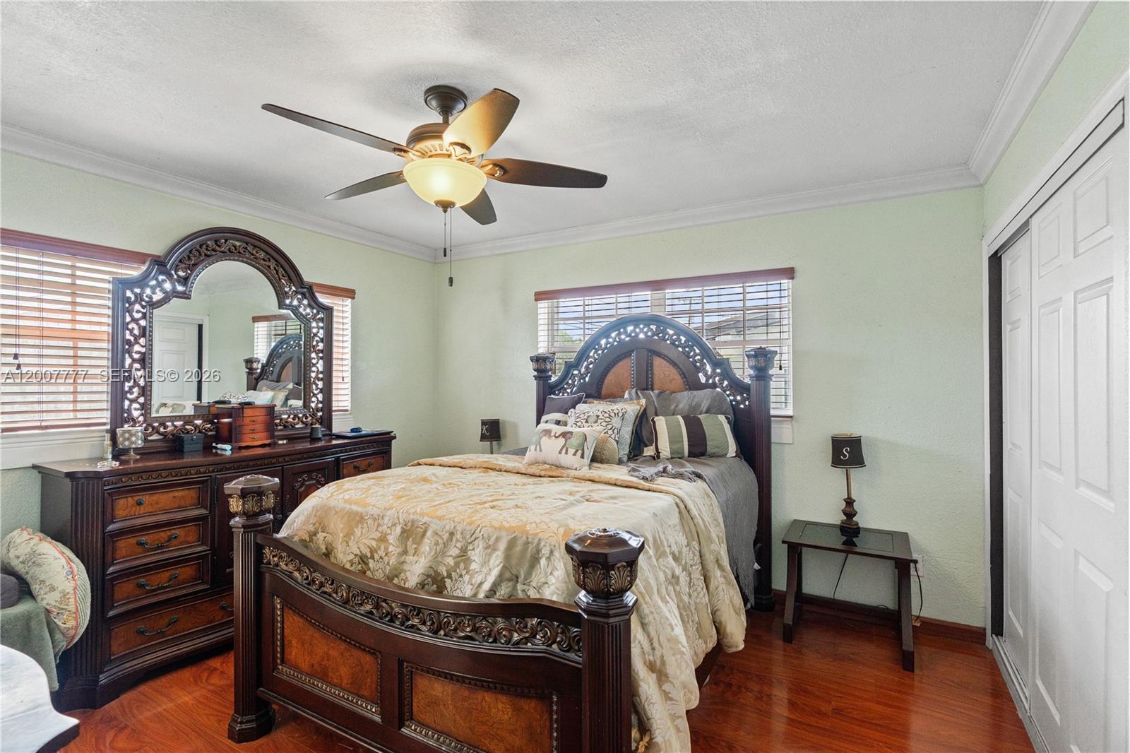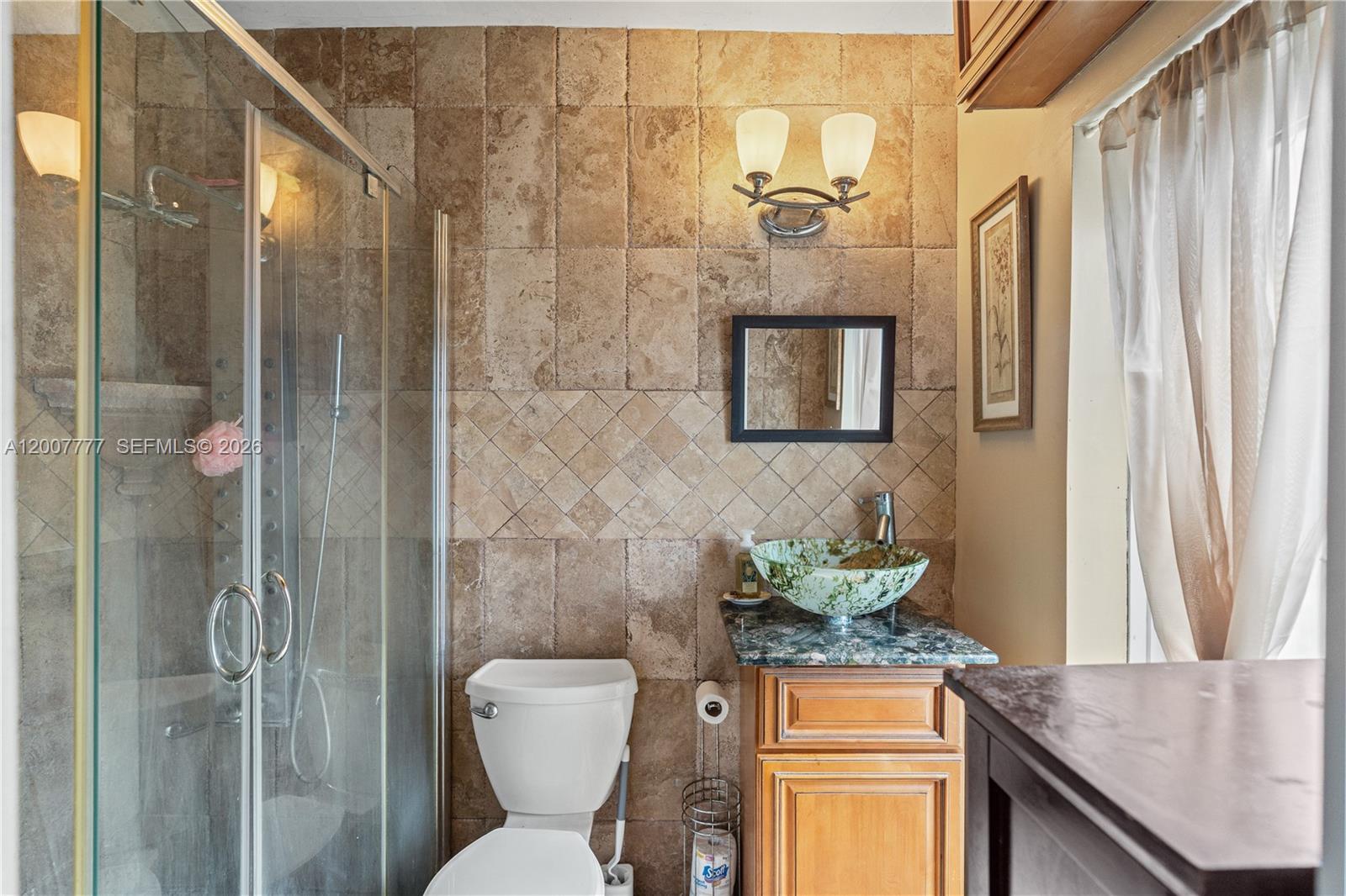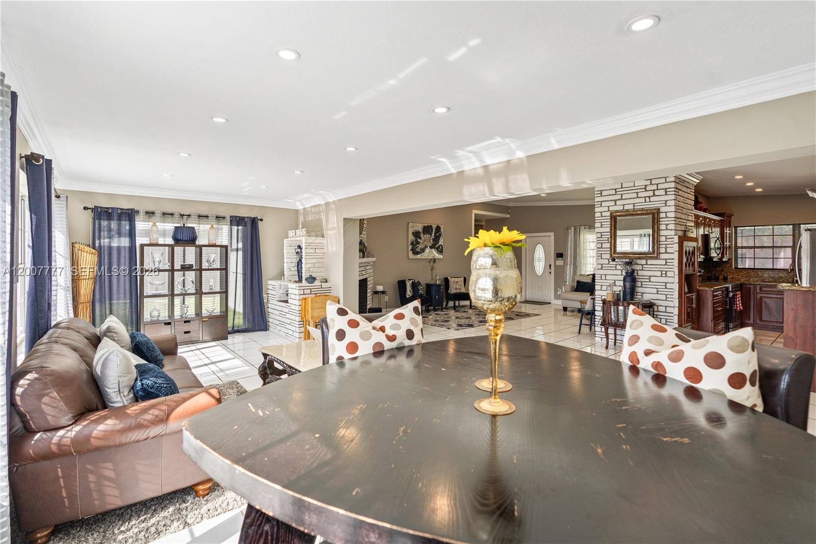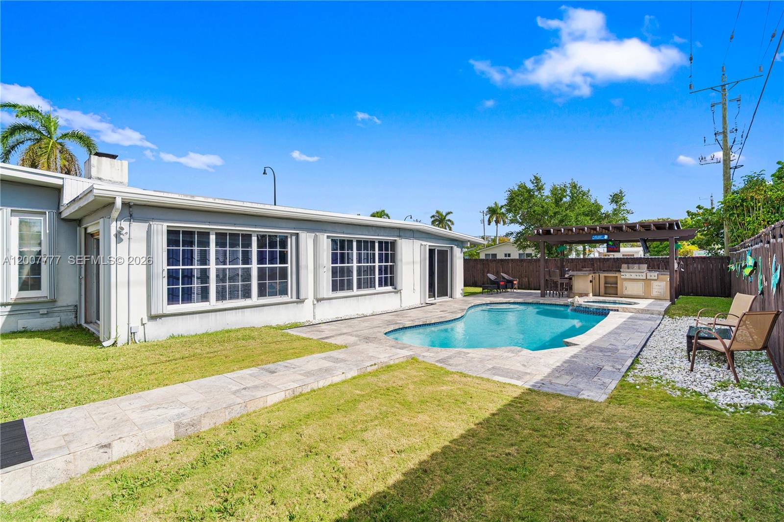 Exceptional corner lot residence featuring a thoughtfully designed layout and an outstanding outdoor living environment. The backyard serves as the focal point, showcasing a custom-shaped swimming pool with integrated spa, resurfaced in 2019, complemented by a natural stone deck, covered pergola, and a fully equipped outdoor kitchen with bar seating. Additional highlights include a detached structure suitable for storage or potential cabana use, as well as a separate wood deck with fire pit. Interior spaces include a spacious open living room with a white brick fireplace, seamlessly connecting to a sunlit Florida room offering expansive pool views. The kitchen is appointed with granite countertops and stainless steel appliances, while the adjacent family room provides a comfortable secondary living area. Bedrooms are positioned on a split level and feature wood flooring. A converted garage offers excellent versatility with a private entrance, full bathroom, and mini-split A/C, making it suitable for in-law quarters, office space, or income-producing use. Additional features include full accordion shutters, a fenced yard, and multiple parking options including side driveway access.